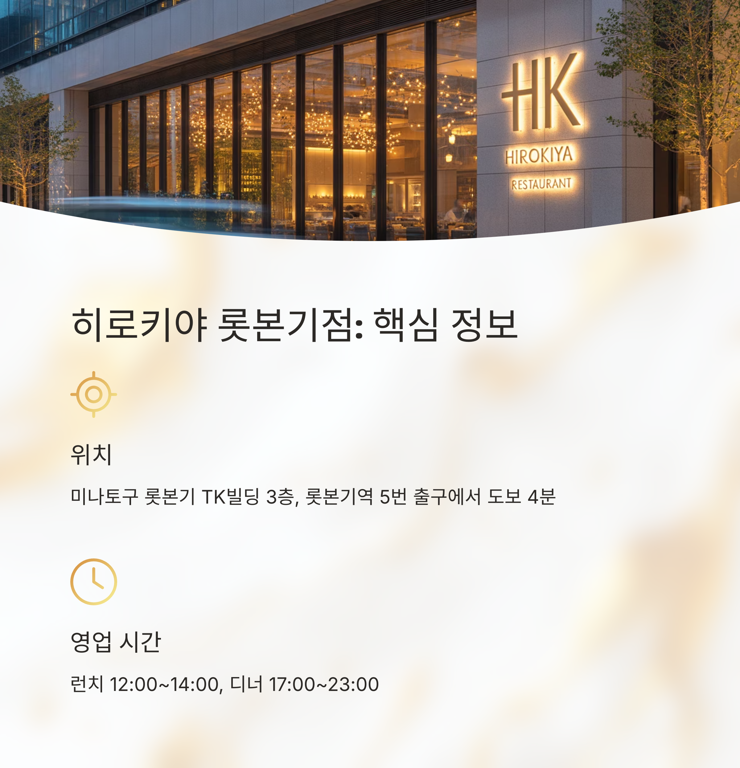 첫 번째 추천 맛집은 히로키야 롯본기점입니다. 이곳은 깔끔한 모노톤 인테리어와 함께 고급스러운 분위기를 자랑합니다.