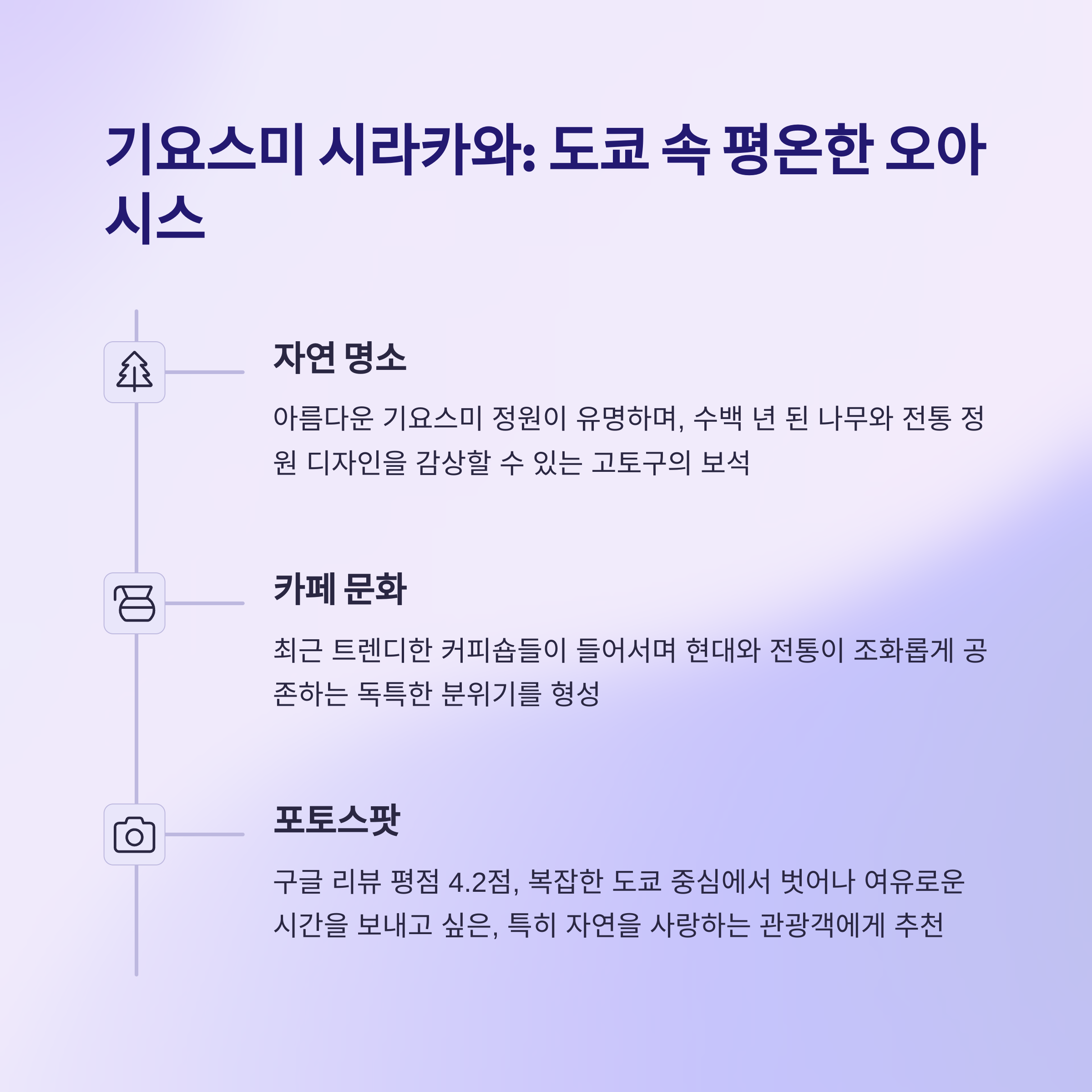 아메야 요코초나 기요스미 시라카와와 같은 전통적인 요소를 간직한 공간은 특별한 경험을 제공합니다.