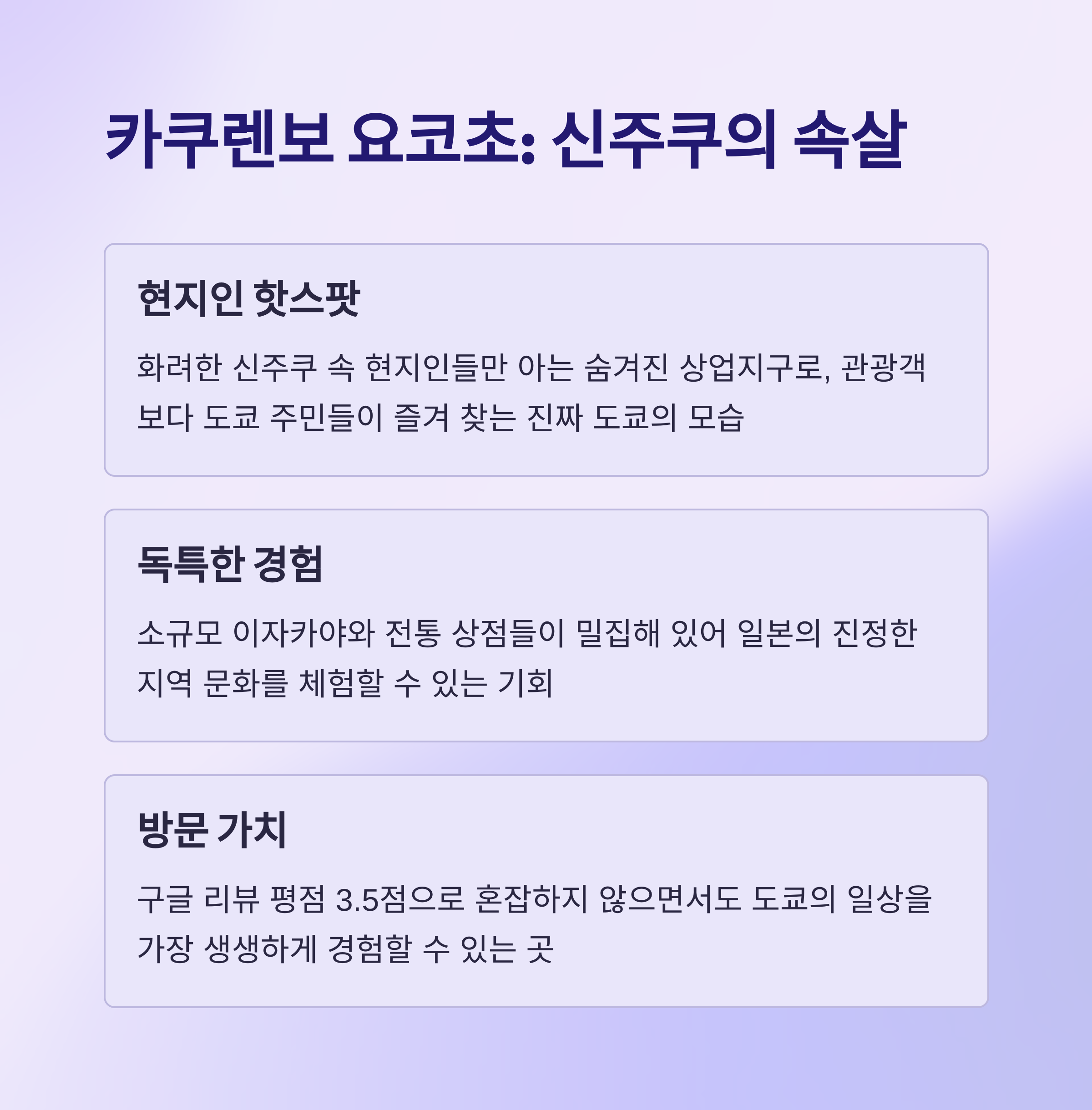 카쿠렌보 요코초와 같은 현대적이고 개성 있는 장소는 젊은 세대에게 인기 있습니다.