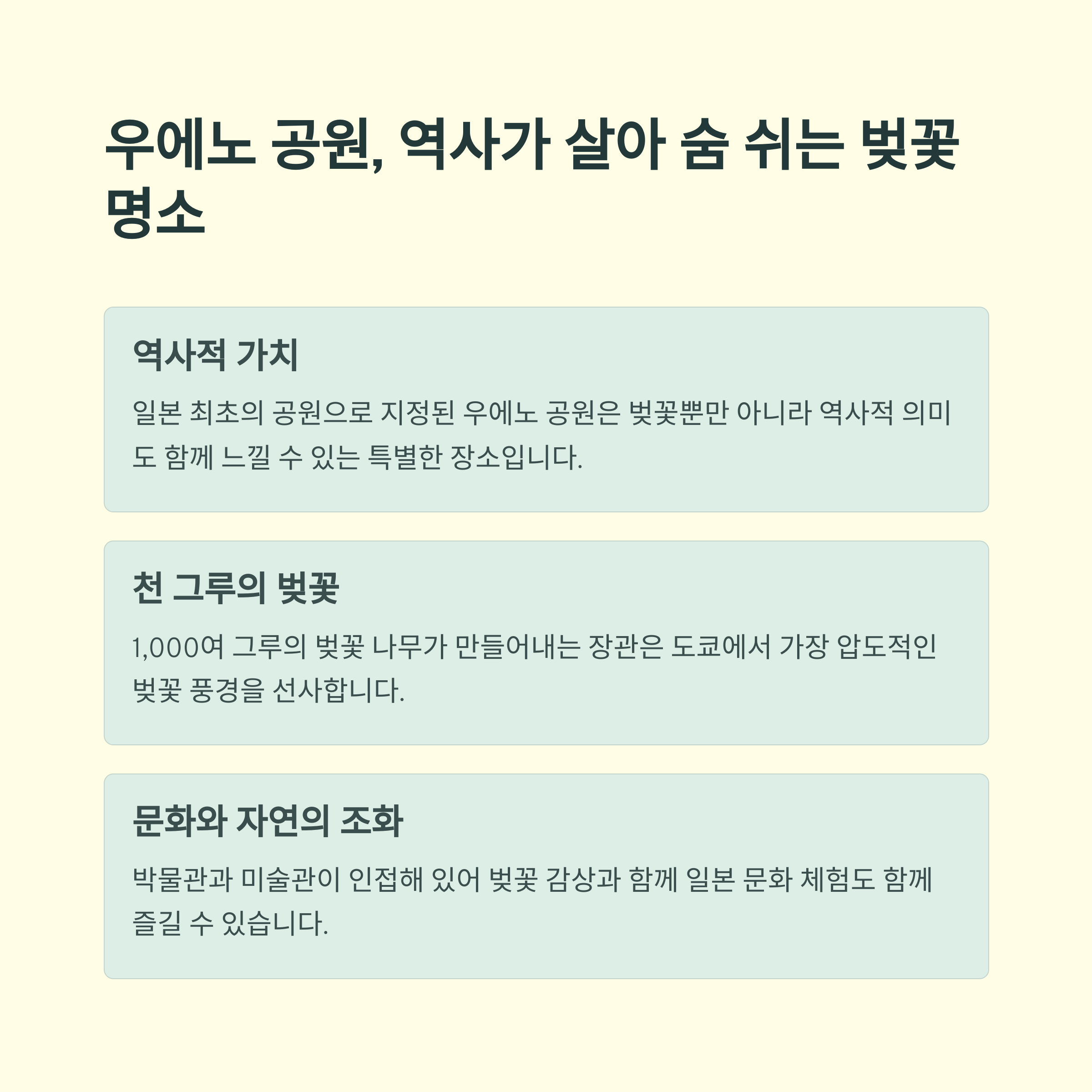 도쿄의 벚꽃 명소는 각기 다른 방식으로 봄의 아름다움을 만끽할 수 있는 독특한 장소들입니다.