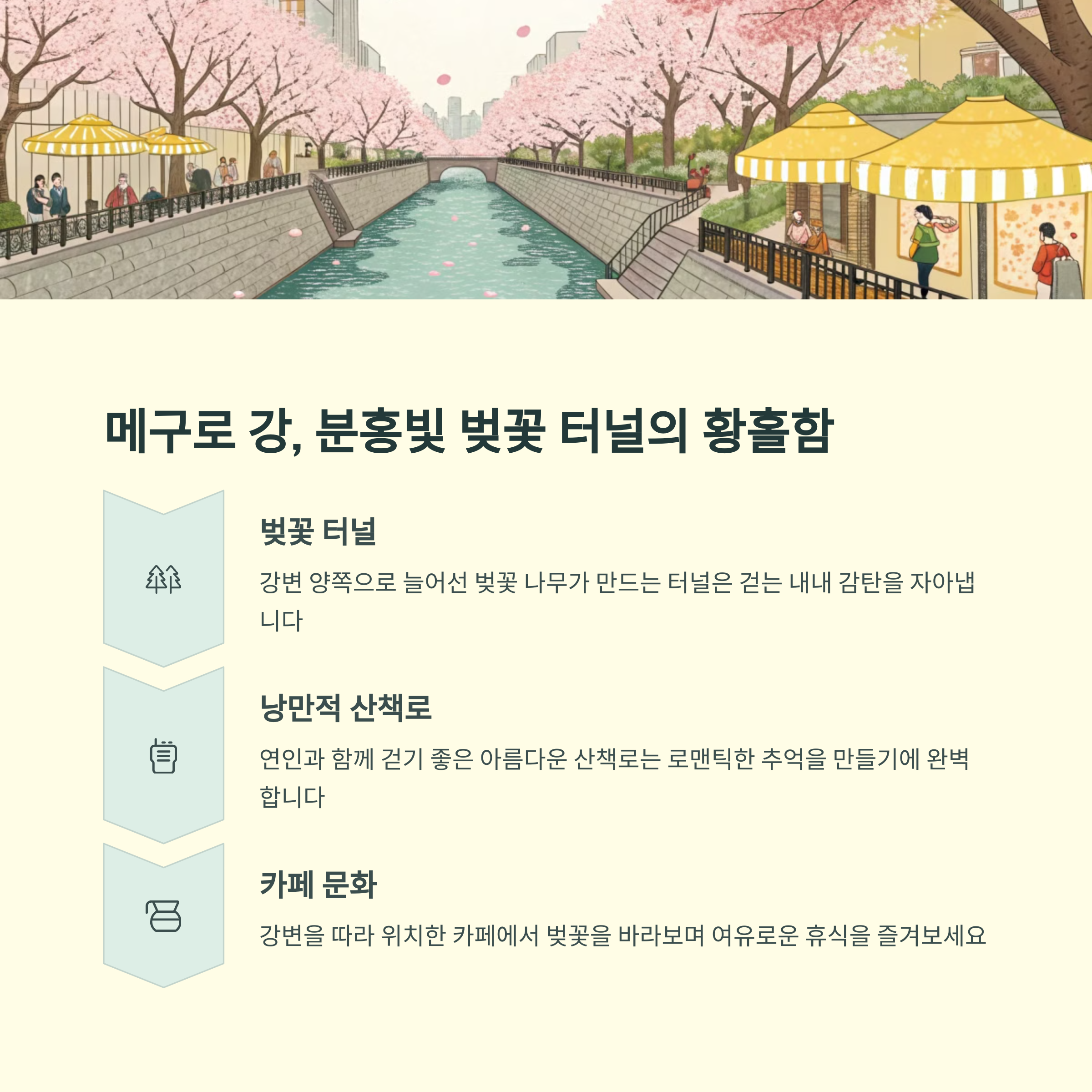 | Q. 메구로 강을 방문할 때 놓치지 말아야 할 포인트는 무엇인가요? |