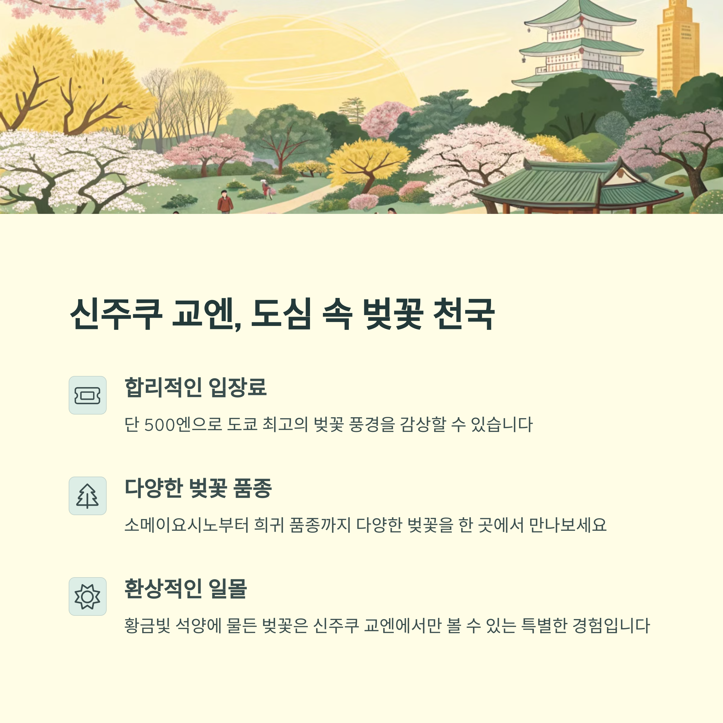| 신주쿠 교엔 | 500엔 | 넓은 정원 | 도쿄 신주쿠구 |