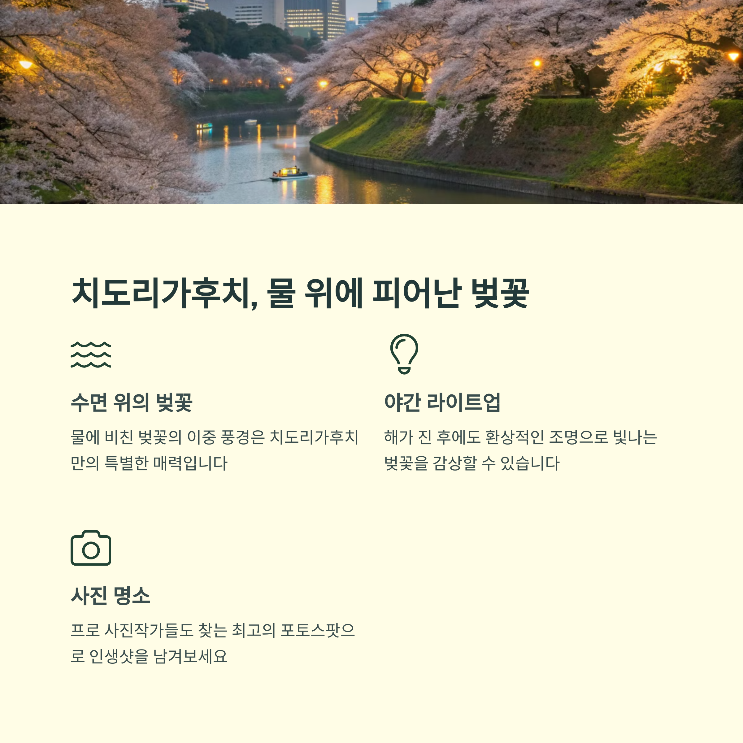 치도리가후치는 수면 위로 드리운 벚꽃과 야간 조명이 어우러져 마치 동화 속 한 장면에 있는 듯한 느낌을 제공합니다.