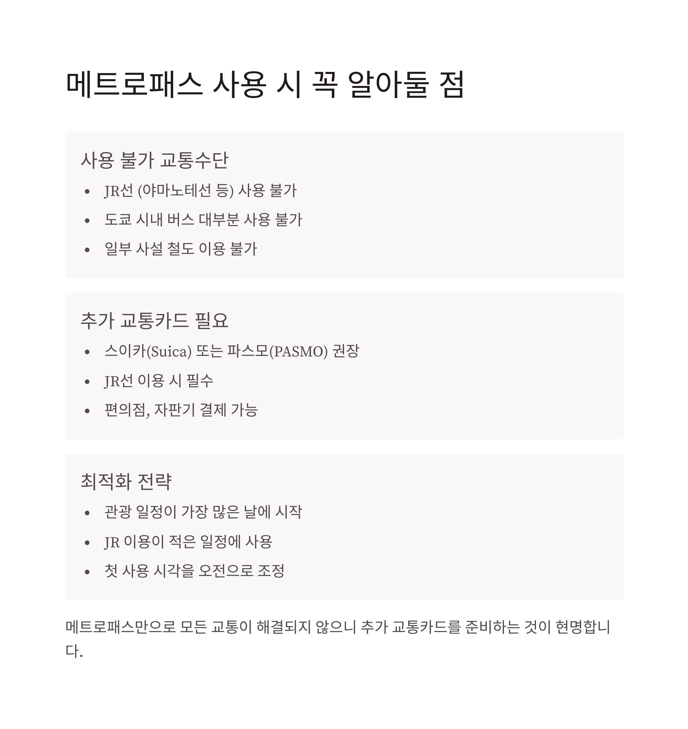 | 도쿄 메트로패스는 JR 노선에는 적용되지 않습니다. JR 노선을 이용하려면 별도의 티켓을 구매하거나 스이카나 PASMO와 같은 충전형 교통카드를 사용해야 합니다. 도쿄 메트로패스는 도쿄 메트로 및 도에이 지하철을 무제한 이용할 수 있으나, 시외로 이동하거나 JR 중심의 노선 사용 시 추가 비용이 필요합니다. 계획적으로 JR 노선 사용 빈도를 최소화하고 메트로패스가 포함된 노선을 최대한 활용하는 것이 비용 절감에 도움이 될 것입니다. |