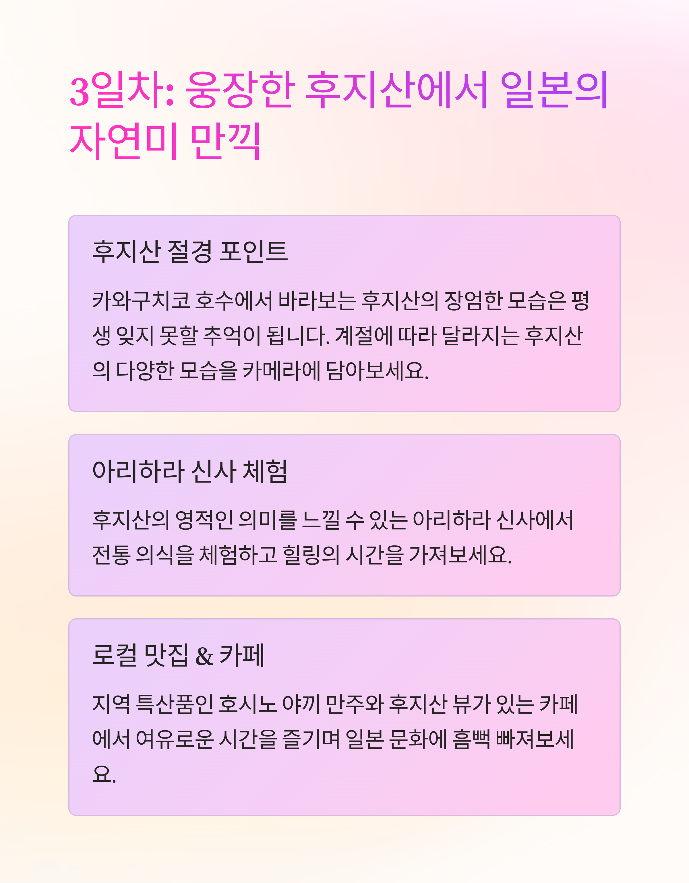 셋째 날은 근교의 후지산을 중심으로 데이투어를 계획하세요. 후지산의 경관과 온천 체험은 색다른 경험을 제공합니다.