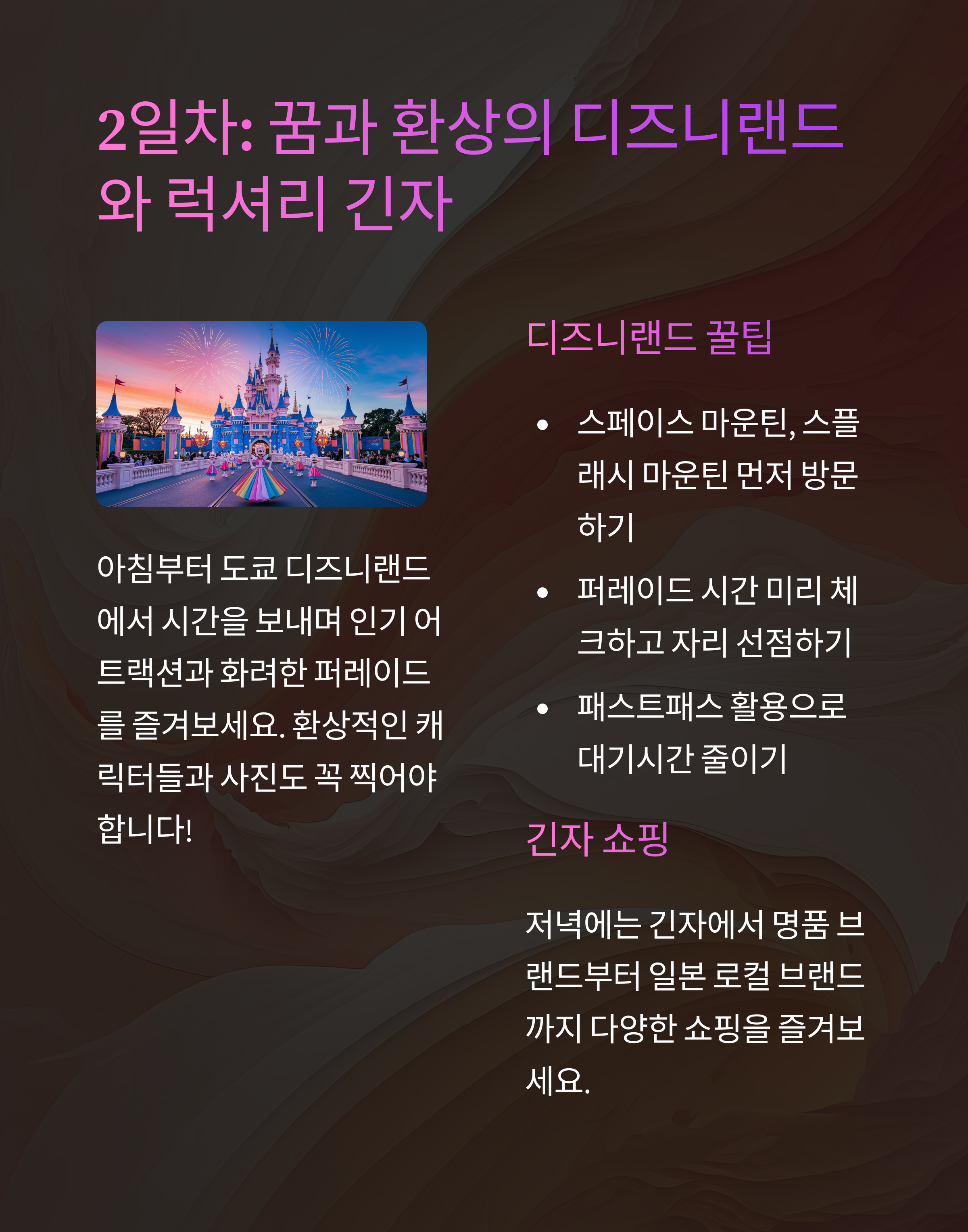 둘째 날은 도쿄 디즈니랜드에서 하루를 보내며 세계적인 테마파크의 매력을 즐긴 다음, 긴자로 이동해 고급스러운 쇼핑의 묘미를 느껴보세요.