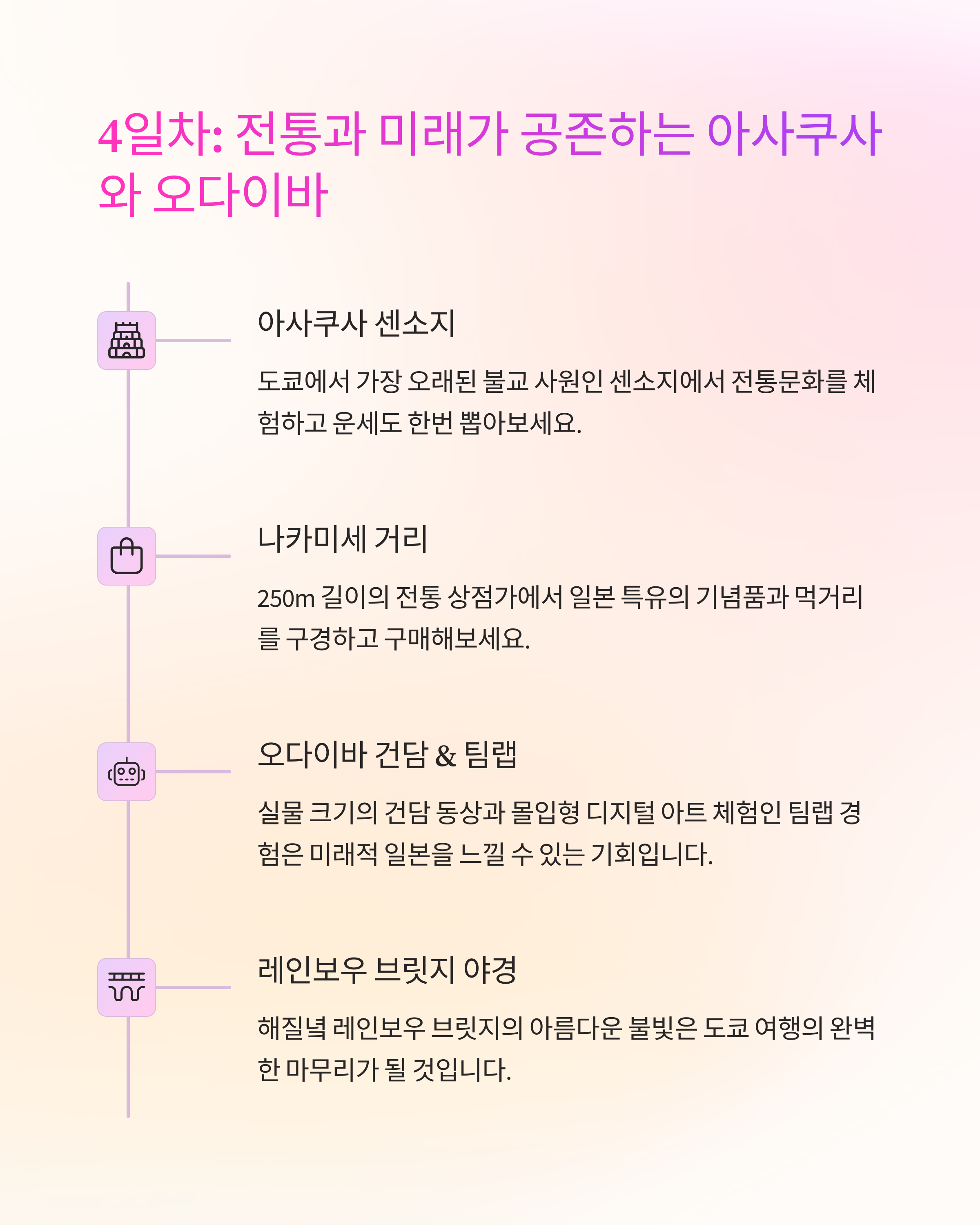 마지막으로, 넷째 날에는 전통의 아사쿠사에서 여행의 마무리를 하고, 오다이바에서 현대적인 전경을 만끽할 수 있습니다.