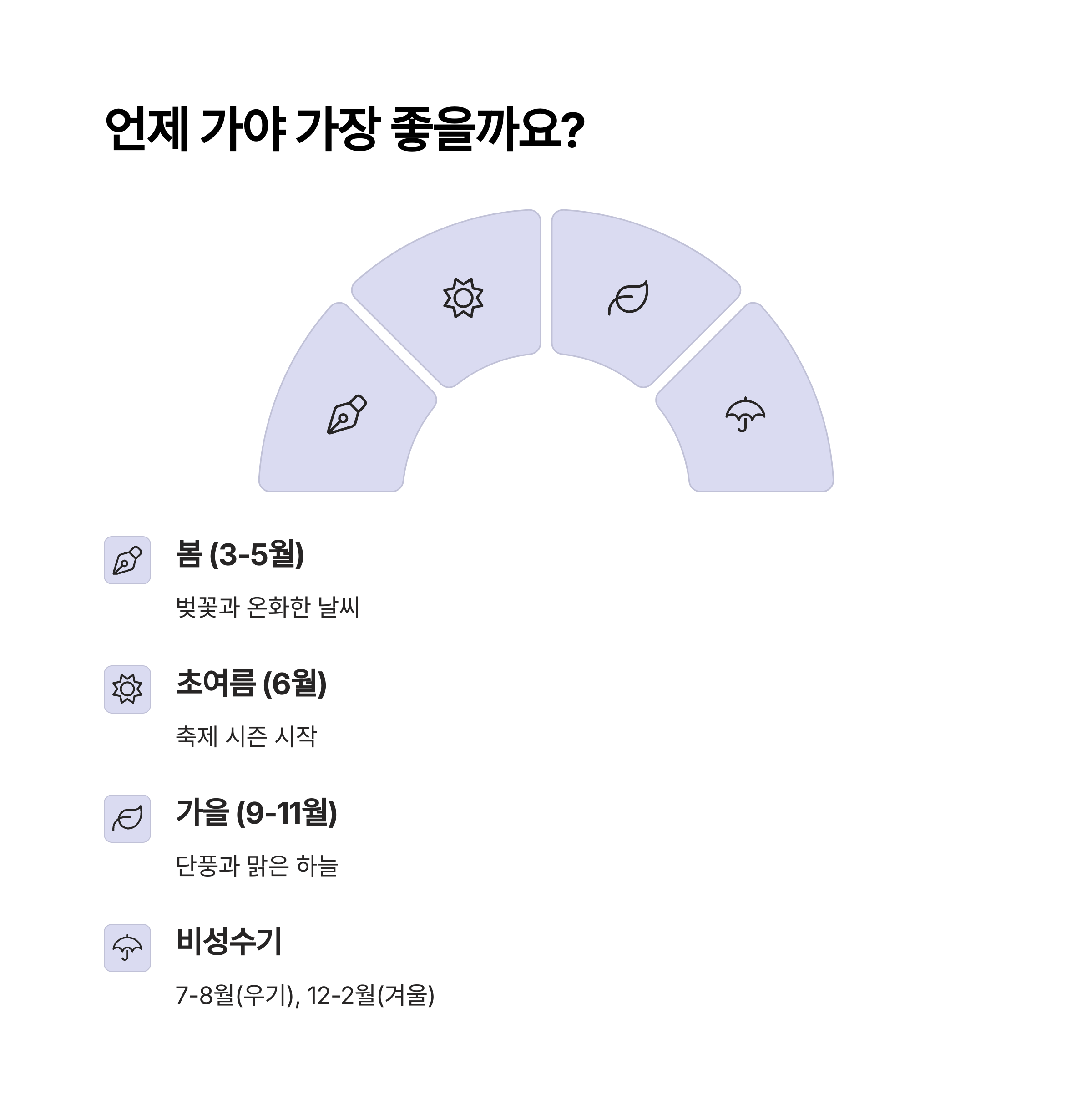 | 여행 시기 | 주요 명소 | 기후 특징 | 추천 활동 |