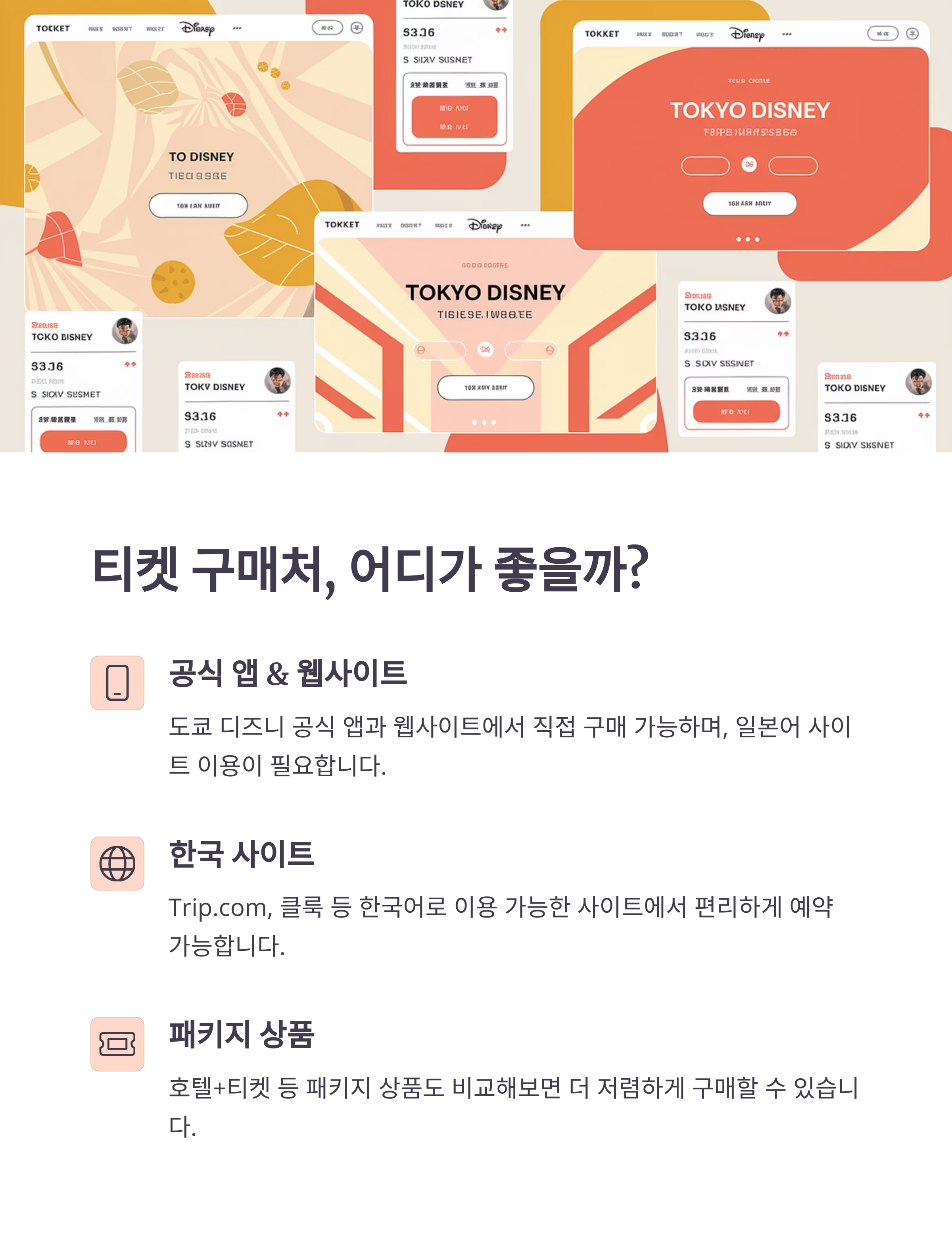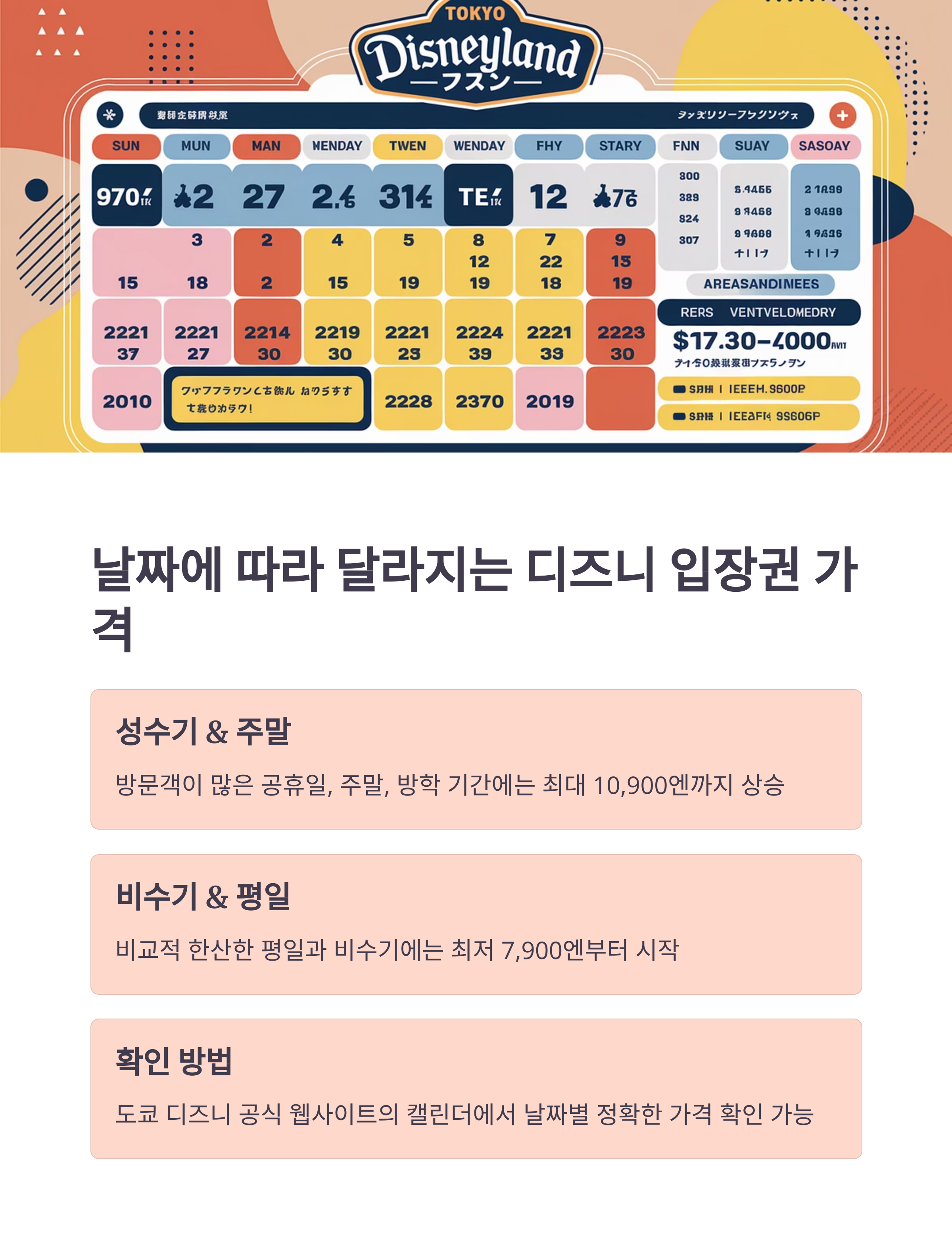 | 티켓 구매는 방문일 약 2개월 전에 진행하는 것이 가장 좋습니다. 도쿄 디즈니랜드는 입장 인원을 제한하기 때문에 조기 매진 가능성이 있습니다. 성수기에는 티켓 수요가 높아 가격 변동이 있을 수 있습니다. 주말 및 공휴일은 매진 확률이 더 높으므로 미리 구매해야 안전합니다. 시즌별로 프로모션이 있을 경우, 여행사 플랫폼도 확인하는 것이 유리합니다. |