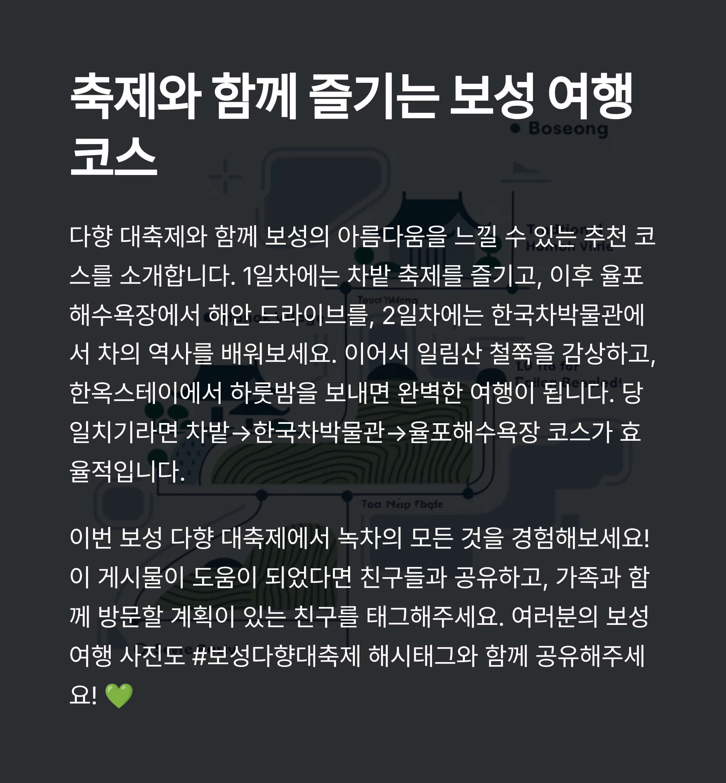 축제만 즐기기 아쉬우시다면, 아래 코스를 따라 1박 2일로 계획해보세요.