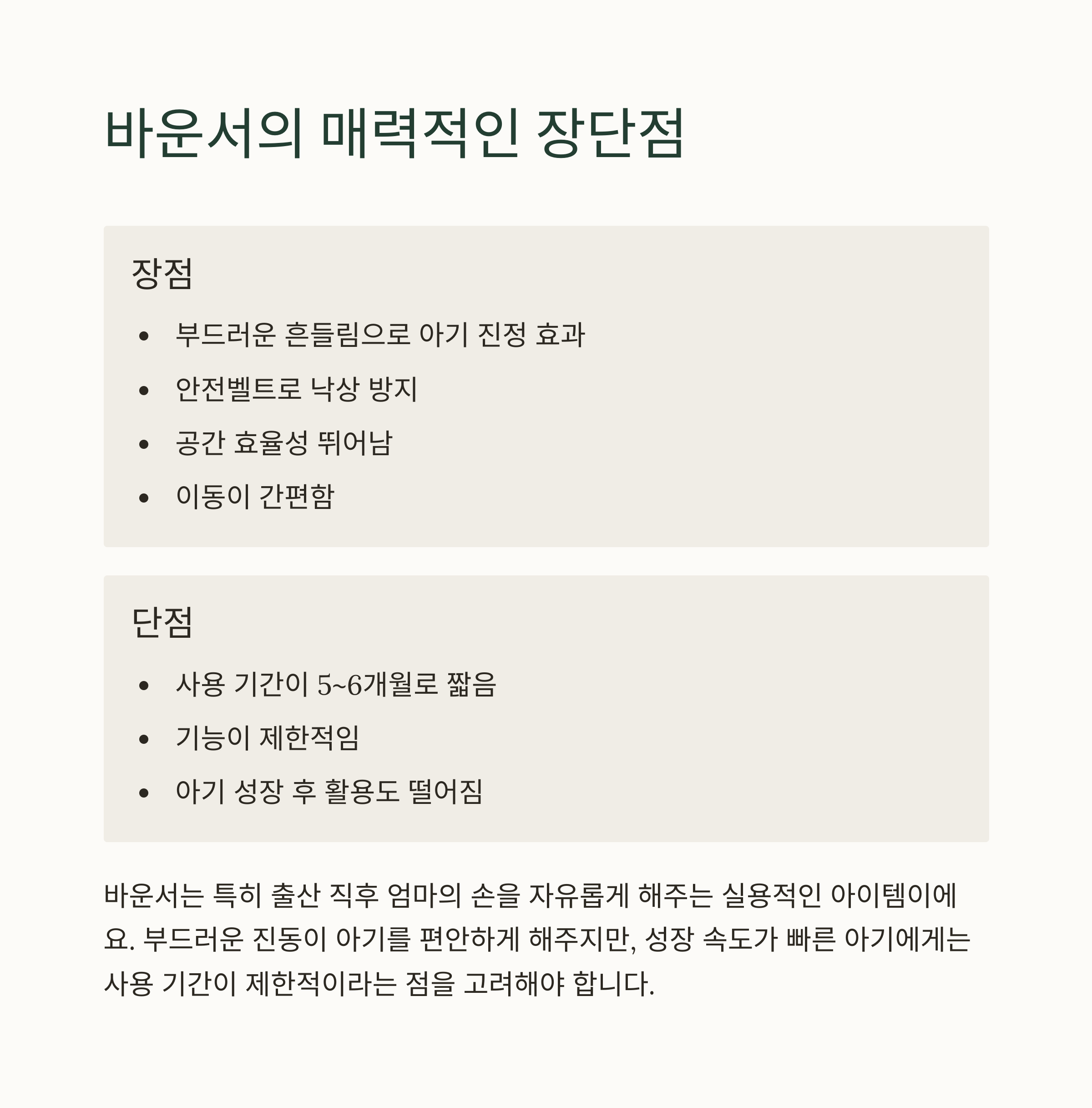 아기가 바운서에서 안심하고 스스로 진정할 수 있는 부드러운 움직임 또한 바운서의 주요 매력 포인트입니다. 반면, 사용 기간이 제한적이라는 제한점과 일부 제품의 소음 문제는 사용 전 유의해야 할 요소입니다.
