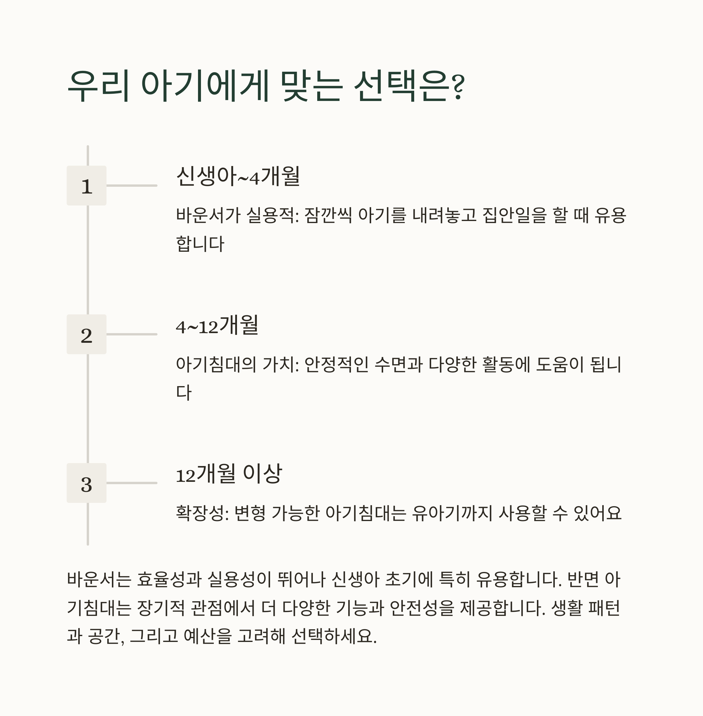 좁은 집이나 이동이 잦은 가족에게는 바운서가 유리할 수 있습니다. 반면, 지속적인 수면 환경을 고려한다면 아기침대가 더 적합한 선택입니다.