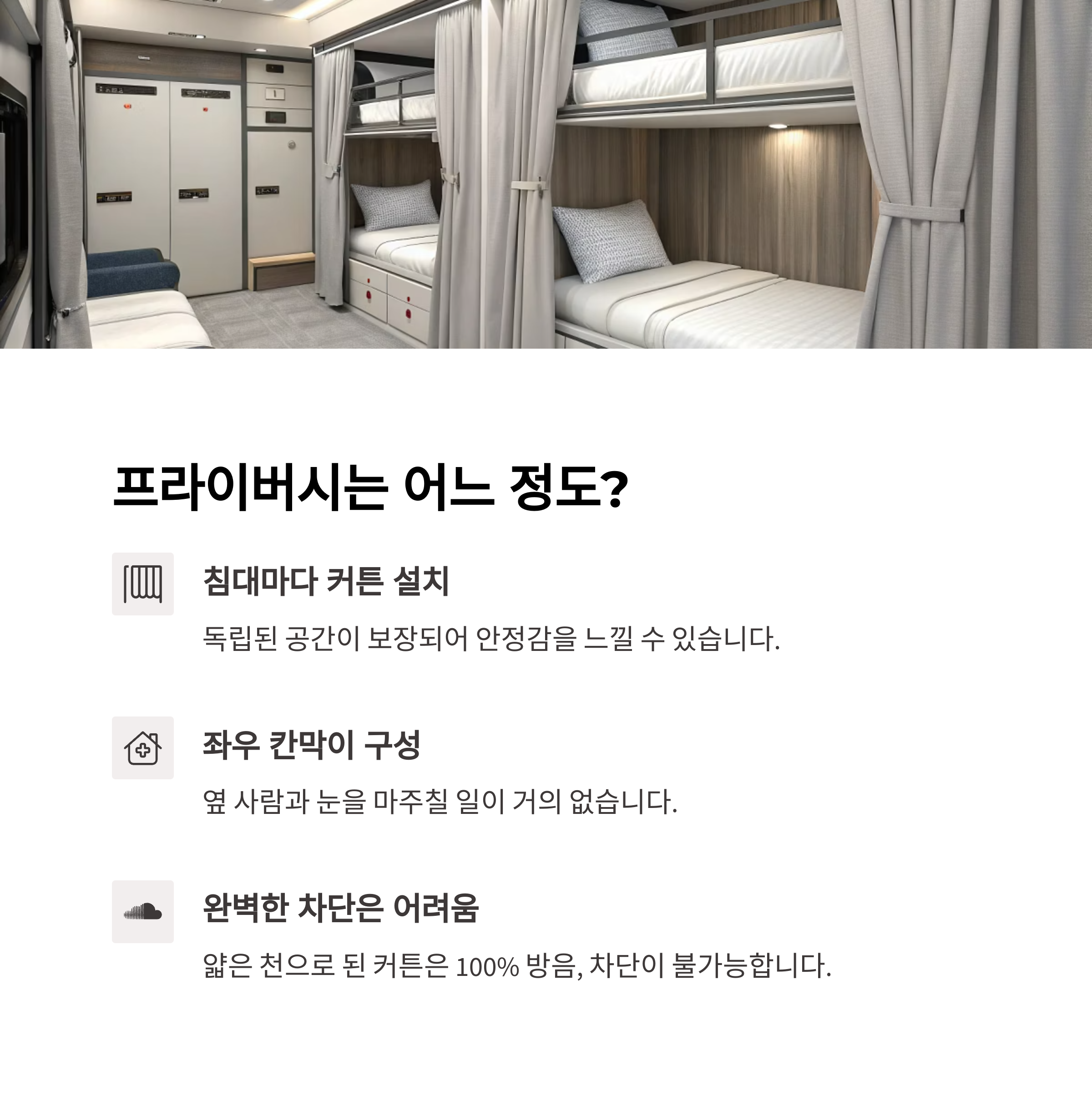 침대마다 커튼이 설치되어 있어 독립된 공간이 보장됩니다.