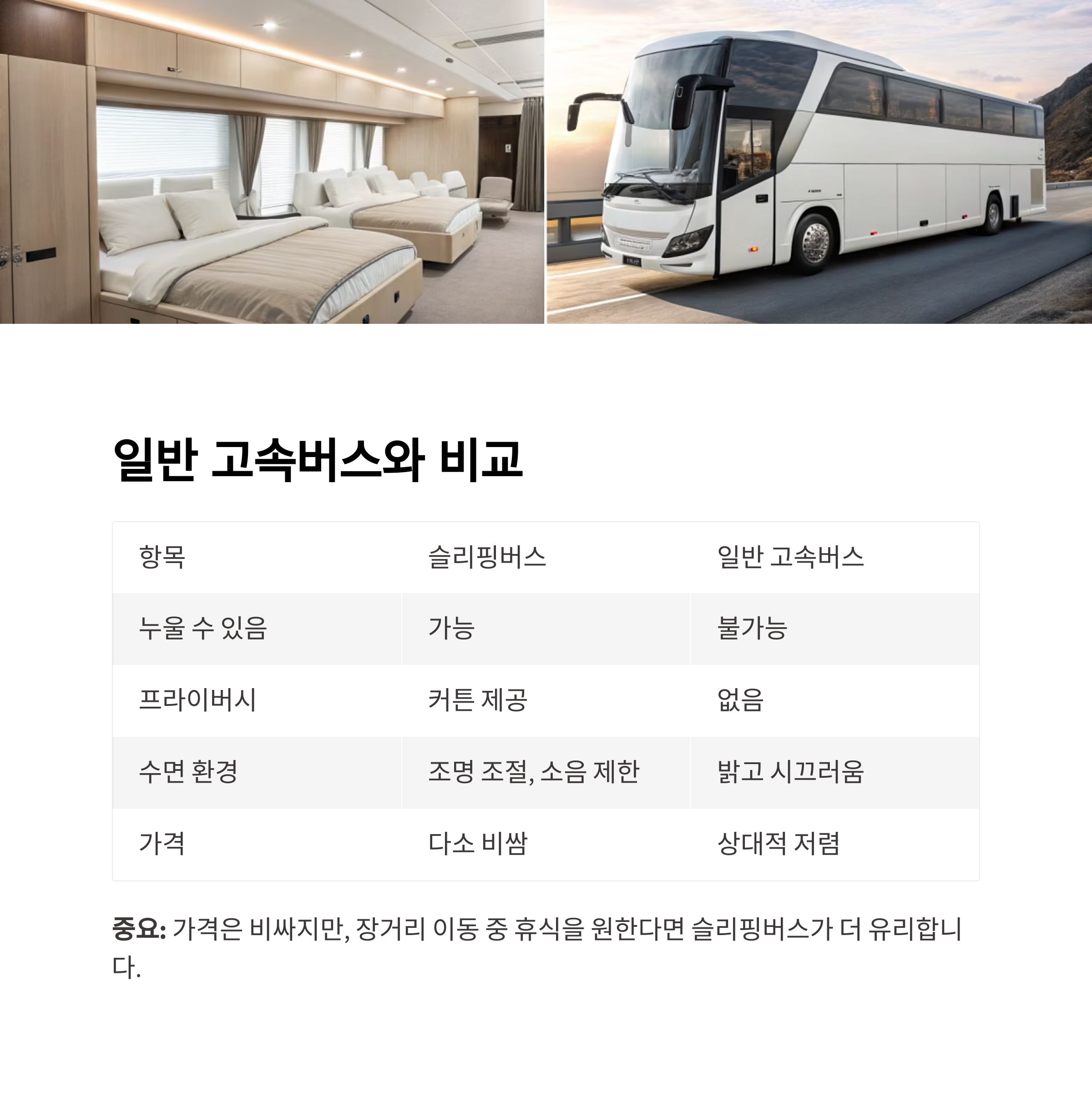 중요: 가격은 비싸지만, 장거리 이동 중 휴식을 원한다면 슬리핑버스가 더 유리합니다.