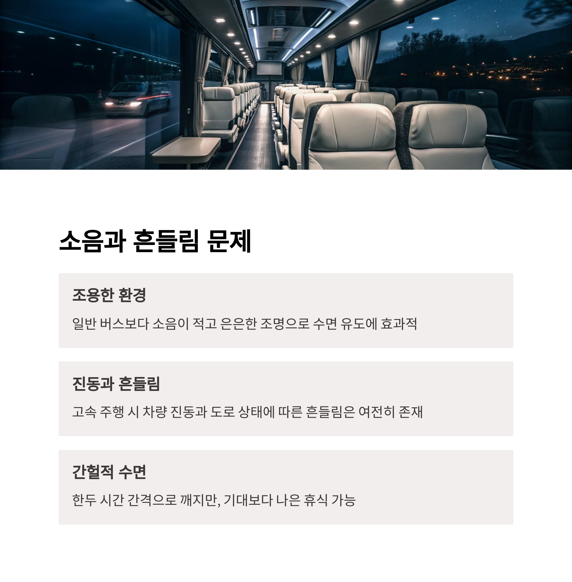 핵심: 일반 버스보다 확실히 편하고, 중간 이상의 휴식이 가능합니다.