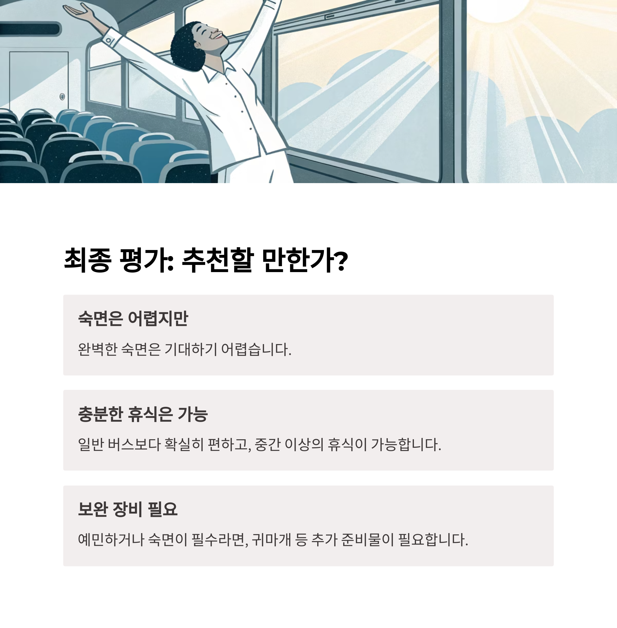 핵심: 일반 버스보다 확실히 편하고, 중간 이상의 휴식이 가능합니다.