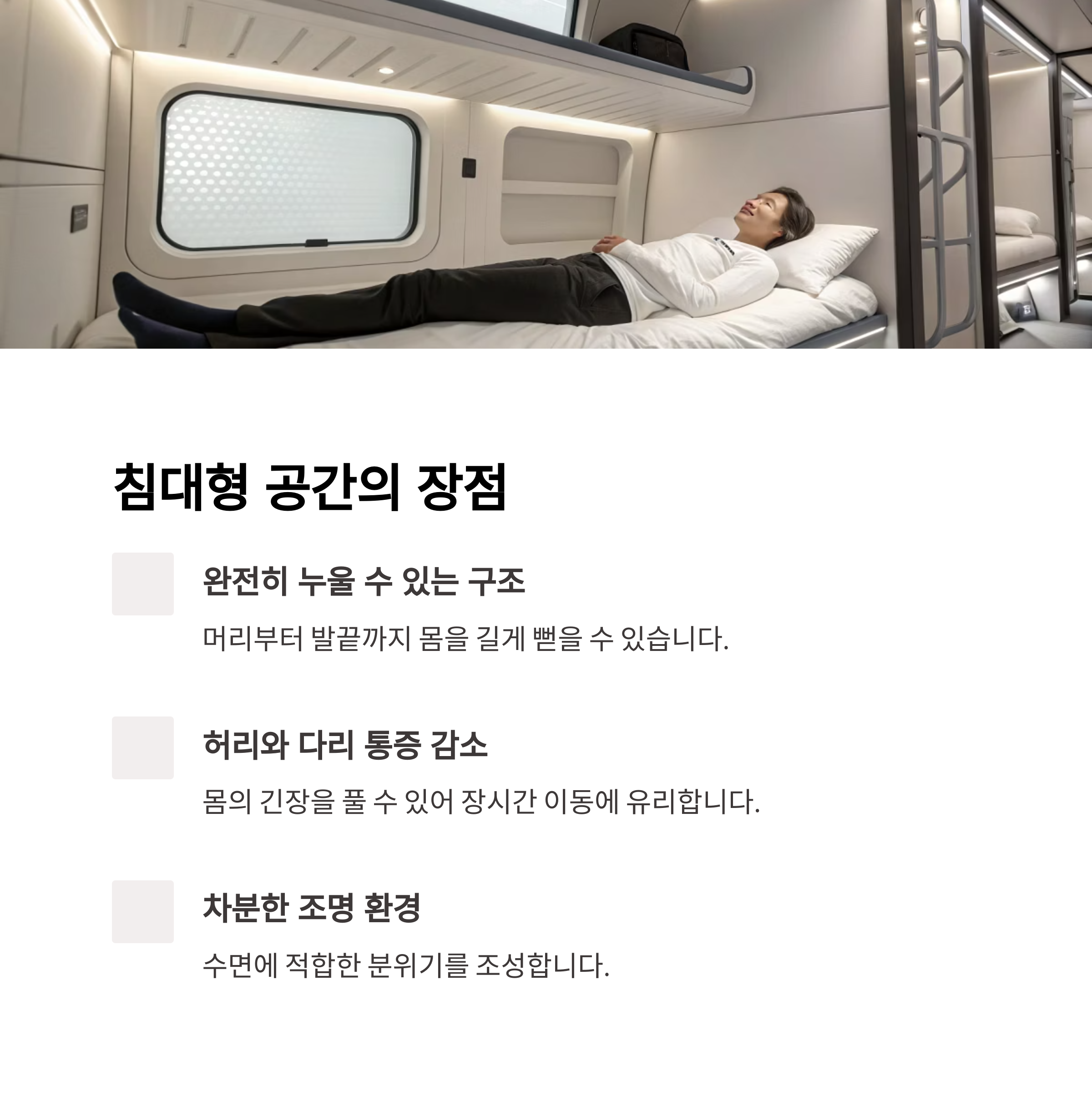 자주 장거리 이동을 하거나 비행기처럼 누워서 쉬고 싶다면 한 번쯤 체험해볼 만합니다.