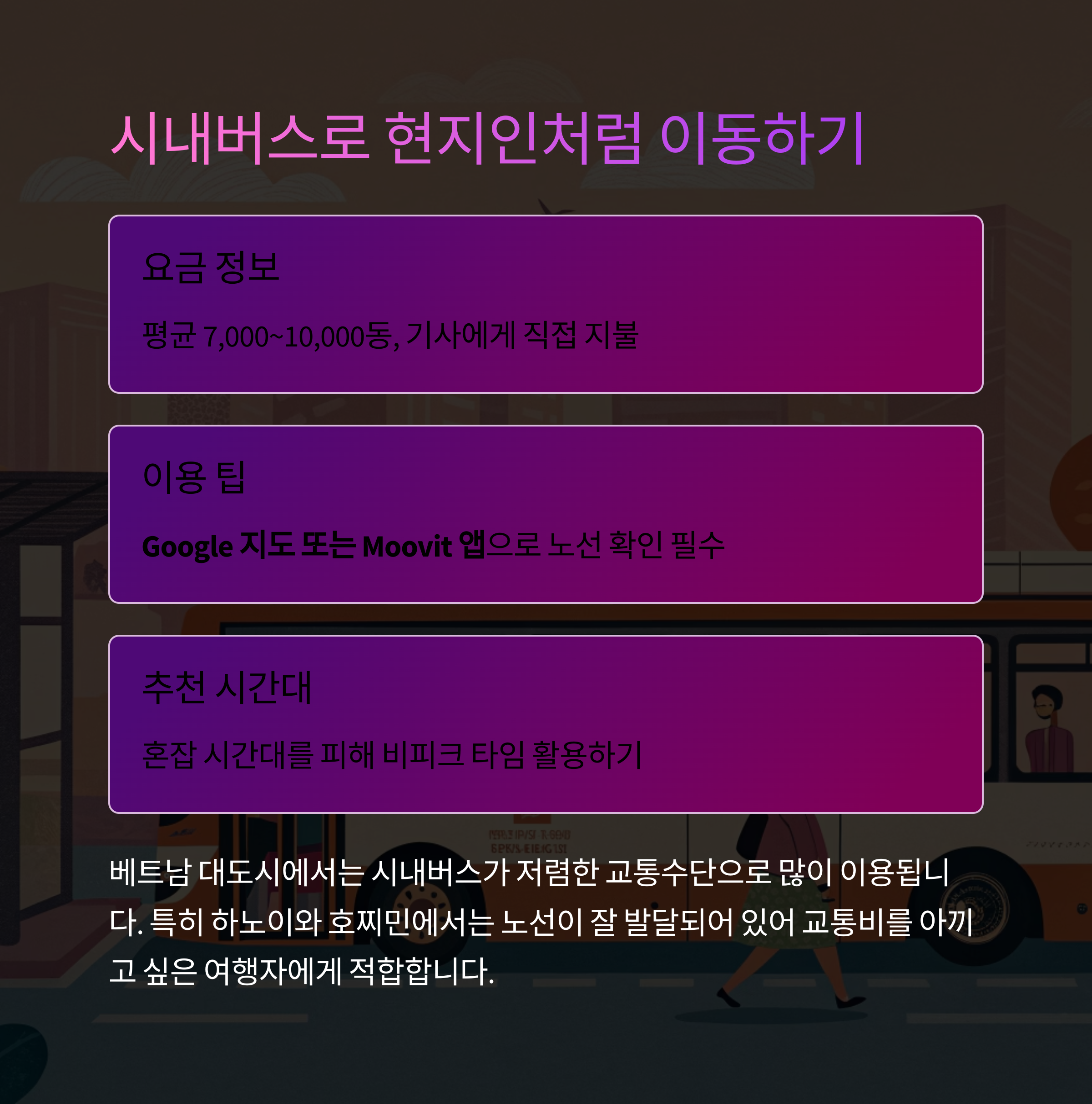 특히 하노이와 호찌민에서는 노선이 잘 발달되어 있어 교통비를 아끼고 싶은 여행자에게 적합합니다.