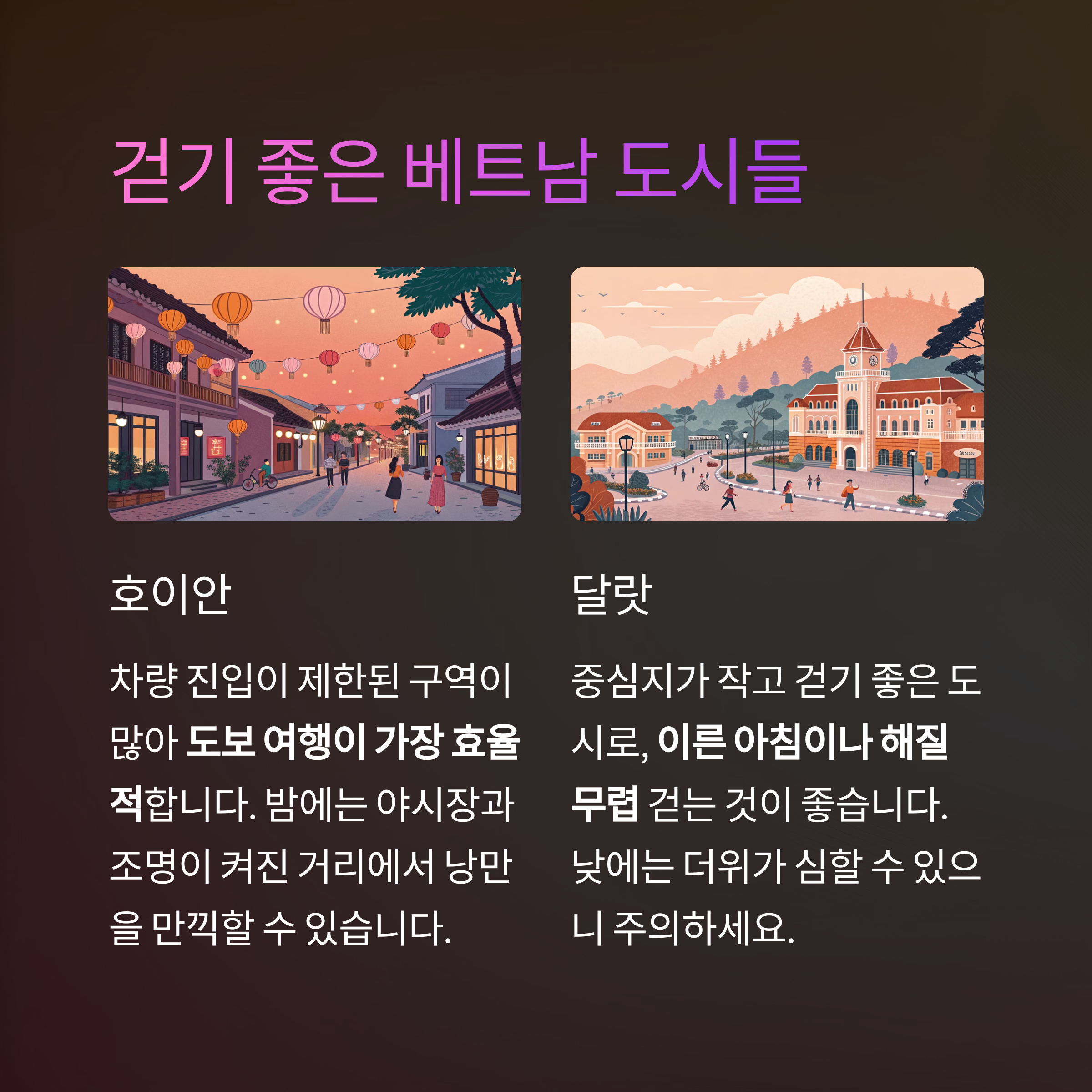 호이안, 달랏 같은 도시는 중심지가 작고 걷기 좋은 도시로 알려져 있습니다.