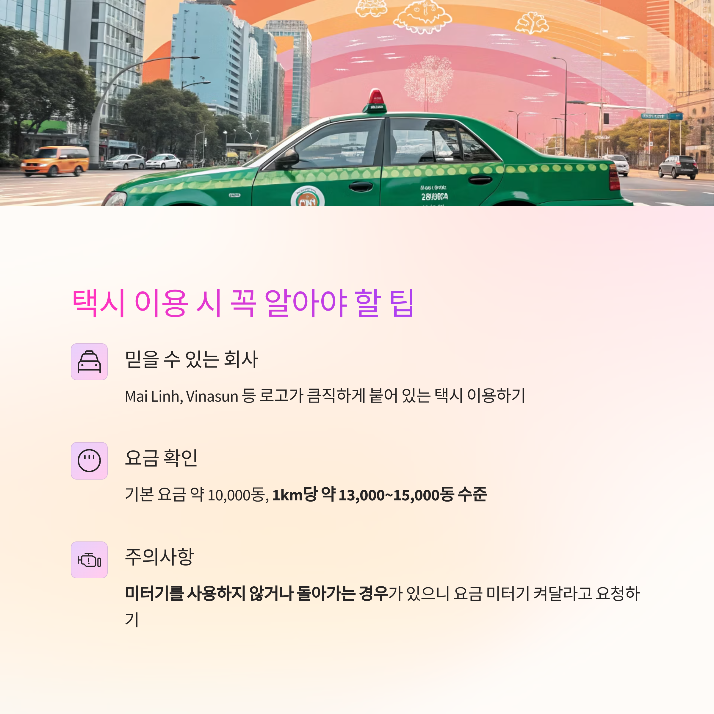 믿을 수 있는 회사로는 Mai Linh, Vinasun 등이 있으며, 차량 외부에 로고가 큼직하게 붙어 있어 쉽게 구분 가능합니다.
