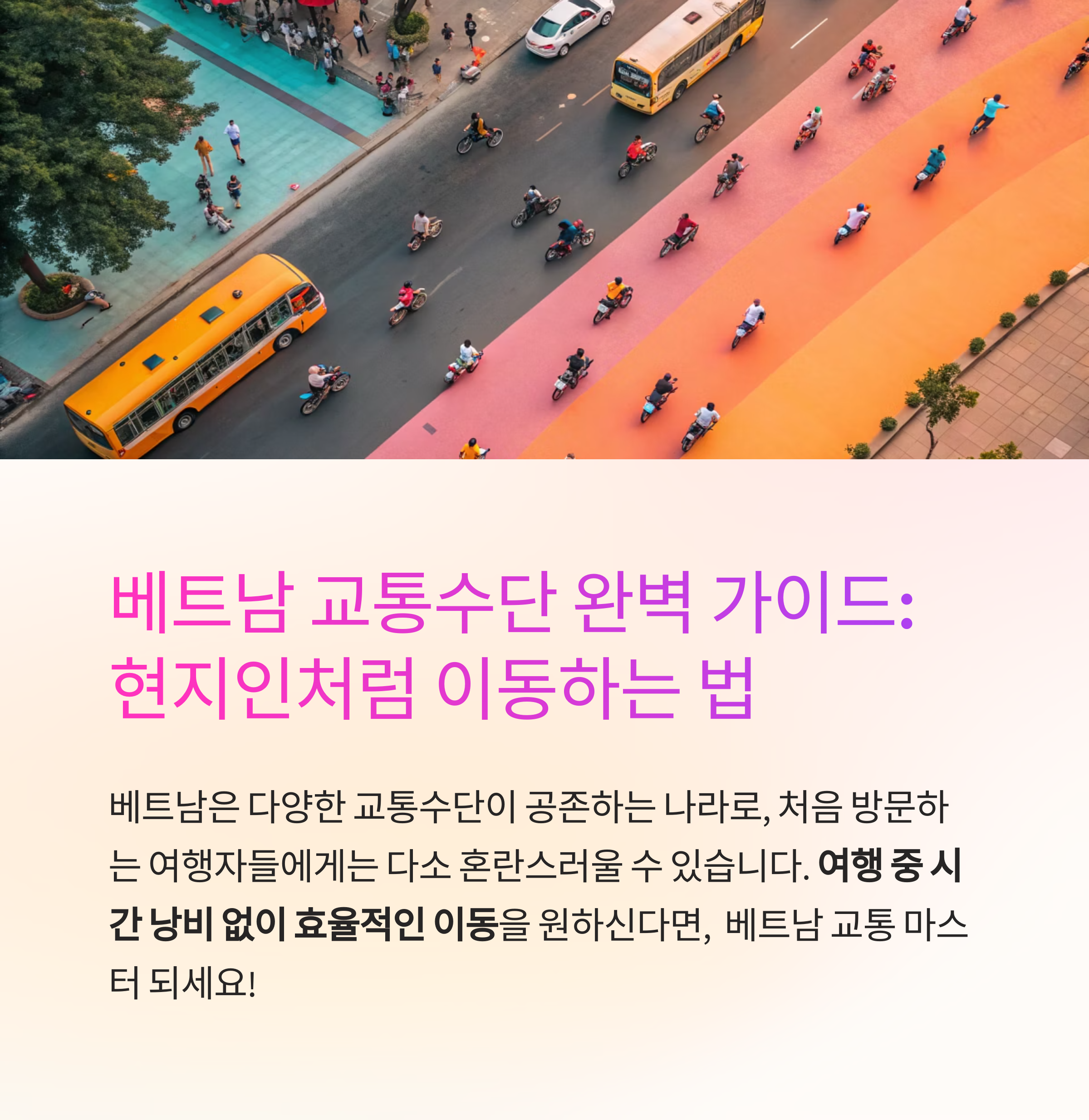 이 글에서는 베트남의 주요 교통수단 종류부터 이용 방법, 요금, 주의할 점까지 한눈에 정리해드립니다.