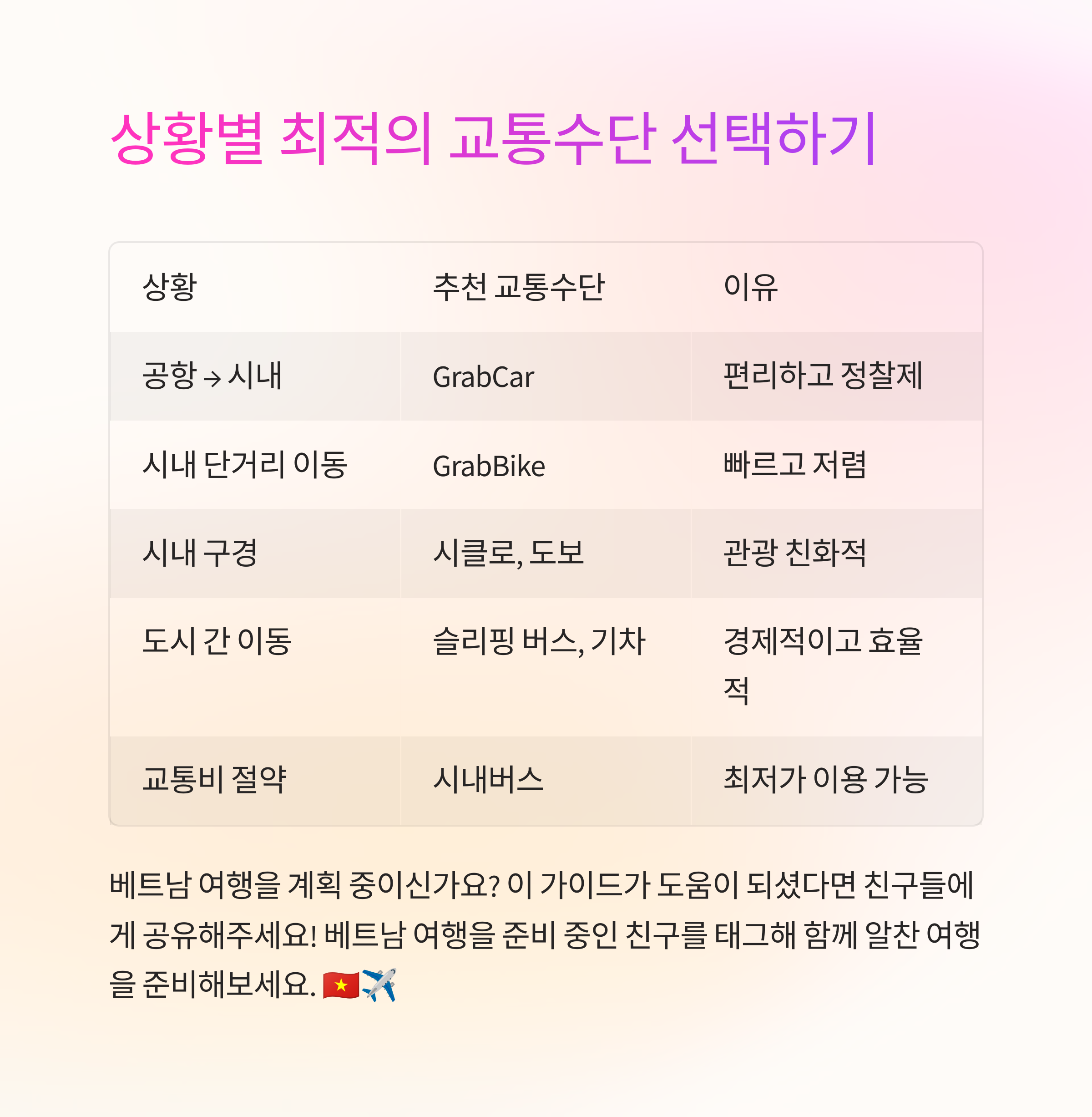 베트남은 다양한 교통수단이 공존하는 나라로, 처음 방문하는 여행자들에게는 다소 혼란스러울 수 있습니다.