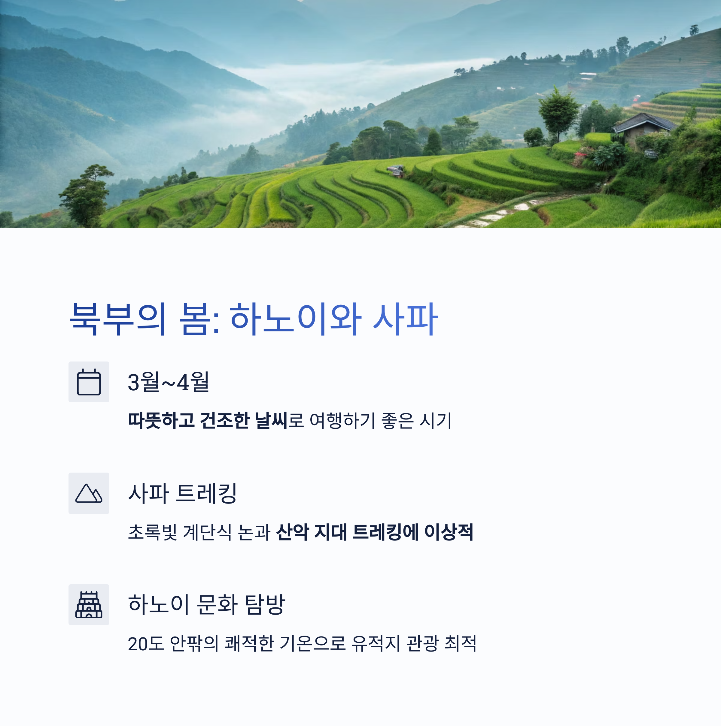 3월부터 북부 베트남은 따뜻하고 건조한 날씨가 이어지며 여행에 가장 적합한 시기입니다. 하노이의 기온은 20도 안팎으로 쾌적하고, 사파의 계단식 논이 초록빛으로 물들기 시작합니다.