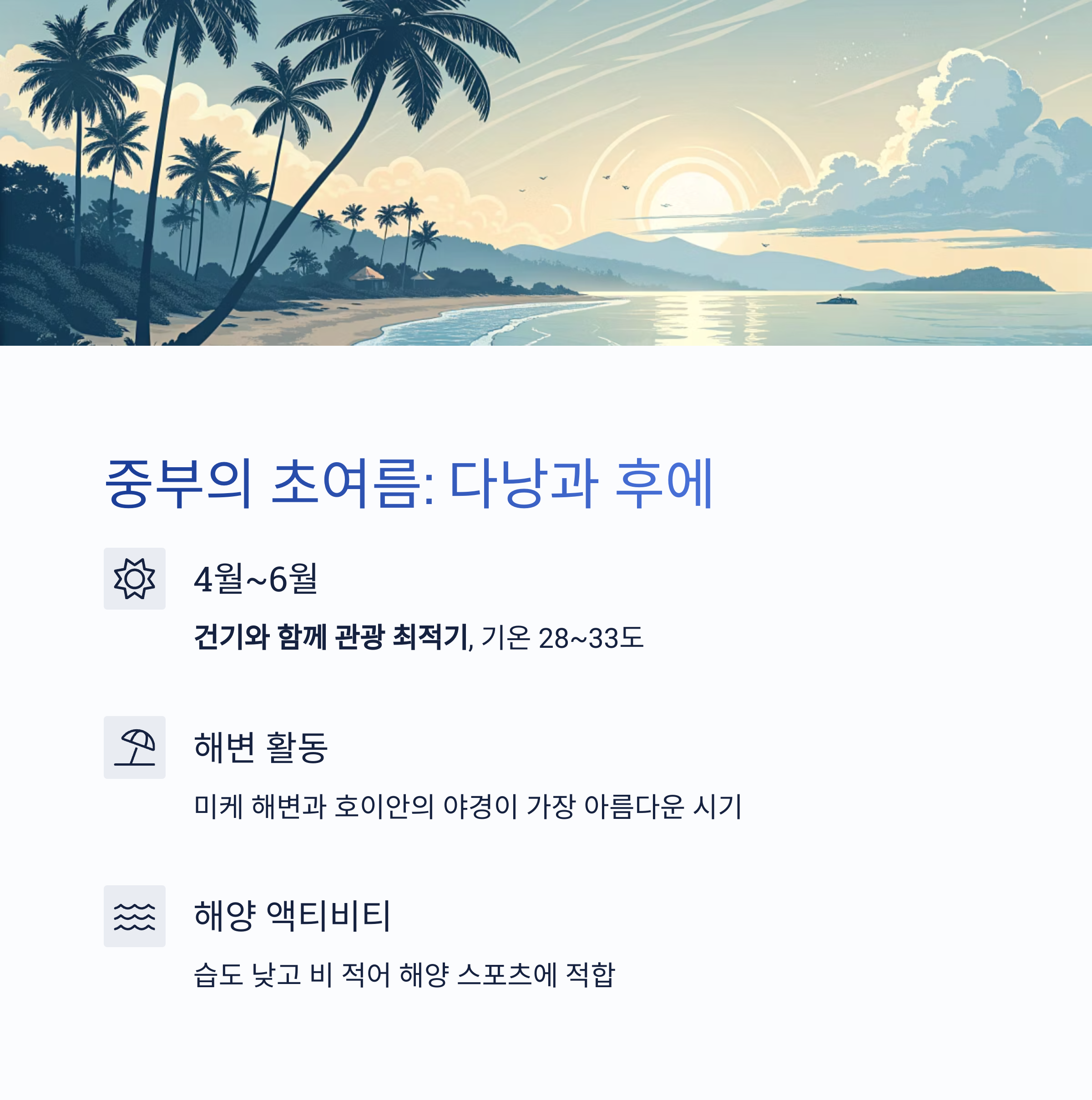 중부 베트남은 4월부터 본격적인 건기와 함께 관광 최적기에 접어듭니다. 다낭과 후에는 낮 기온이 28~33도 사이로 올라가며 맑은 날씨와 바닷바람이 어우러져 해수욕과 시티투어 모두를 즐기기 좋습니다.