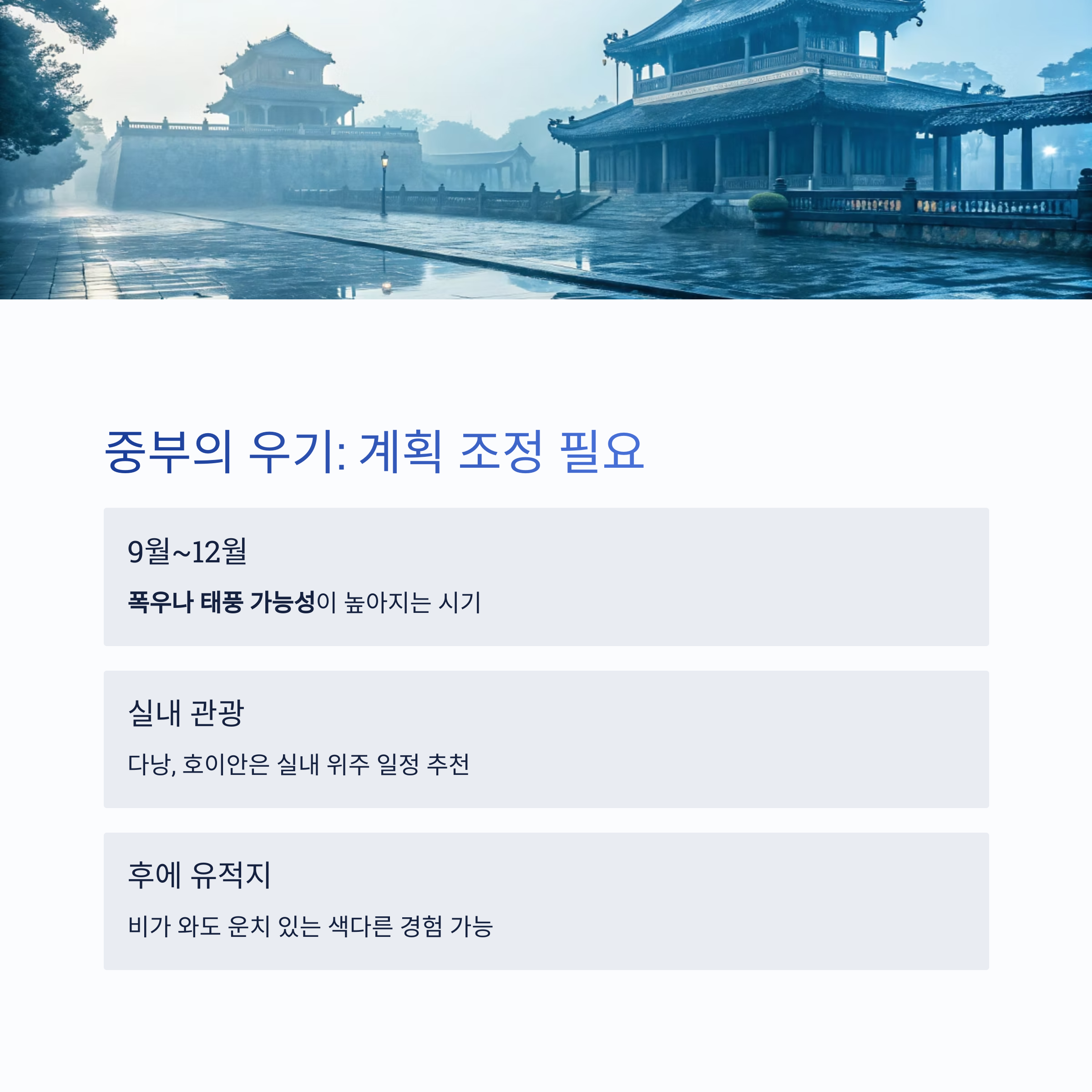 중부는 9월부터 우기에 접어들며, 폭우나 태풍 가능성이 높아집니다. 다낭이나 호이안 등은 계획을 세밀히 조정해야 하며, 실내 관광 위주 일정이 효과적입니다.