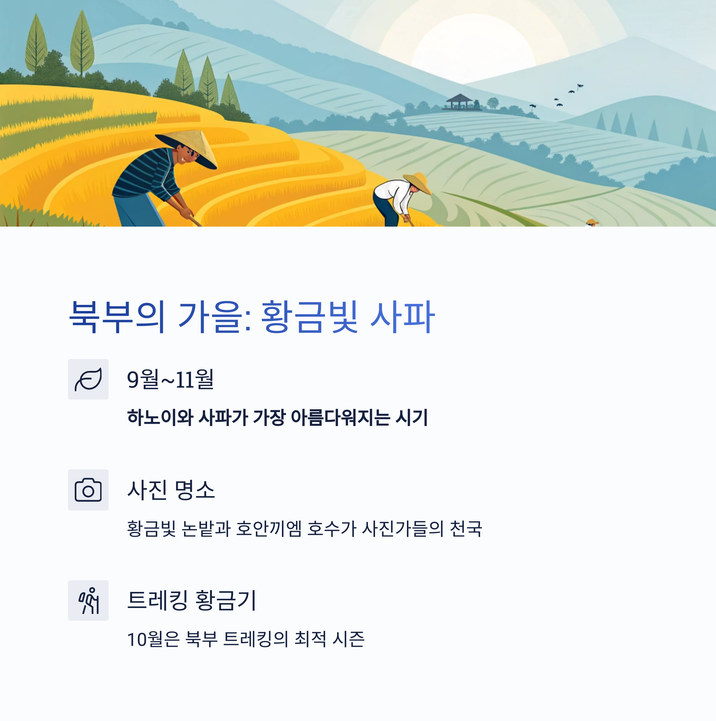 가을의 북부는 하노이와 사파가 가장 아름다워지는 시기입니다. 사파는 황금빛으로 물든 논밭이 장관을 이루며, 하노이는 선선한 바람과 함께 고풍스러운 매력이 살아납니다.