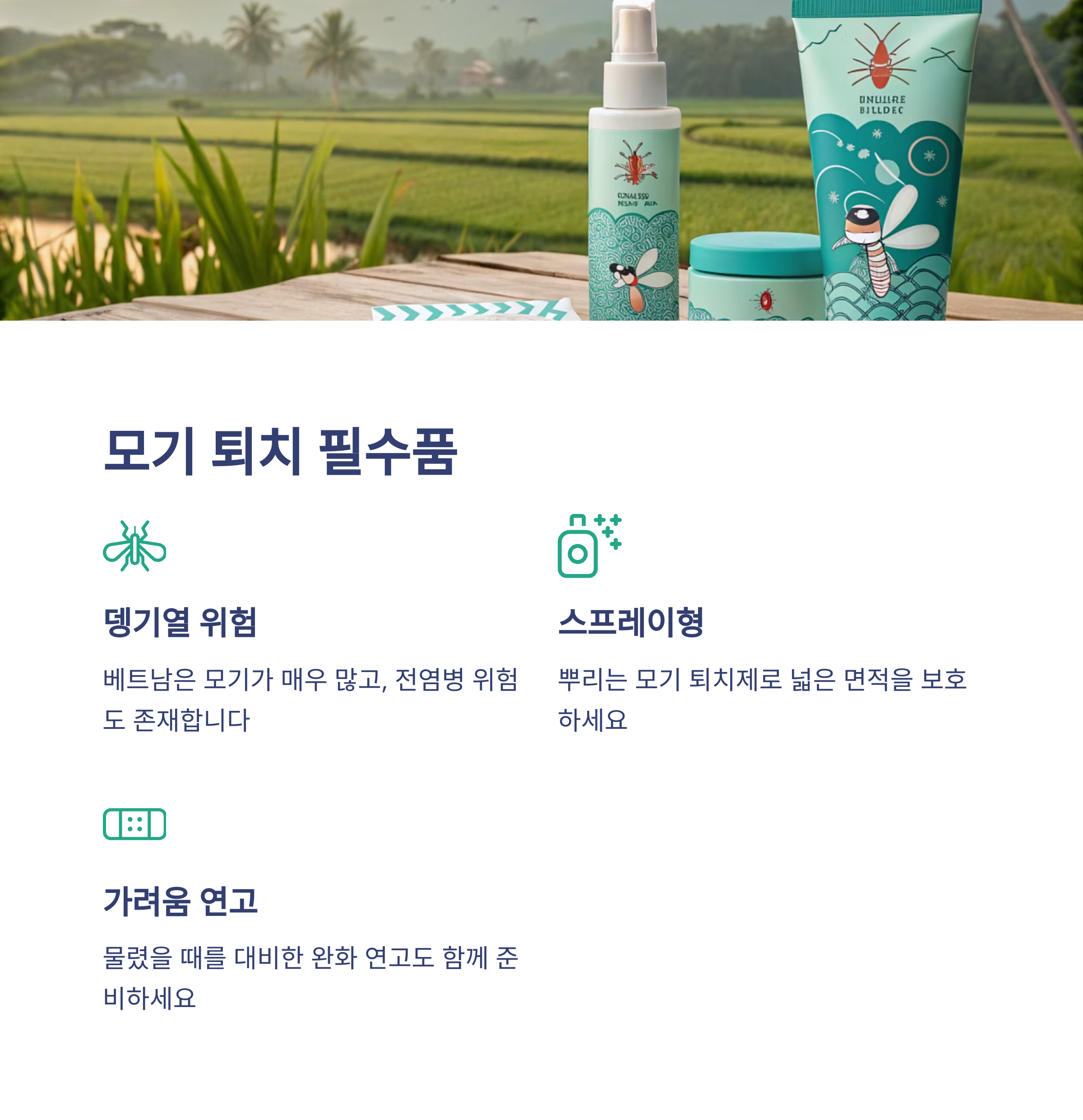 베트남은 모기가 매우 많고, 뎅기열 같은 전염병 위험도 존재합니다.