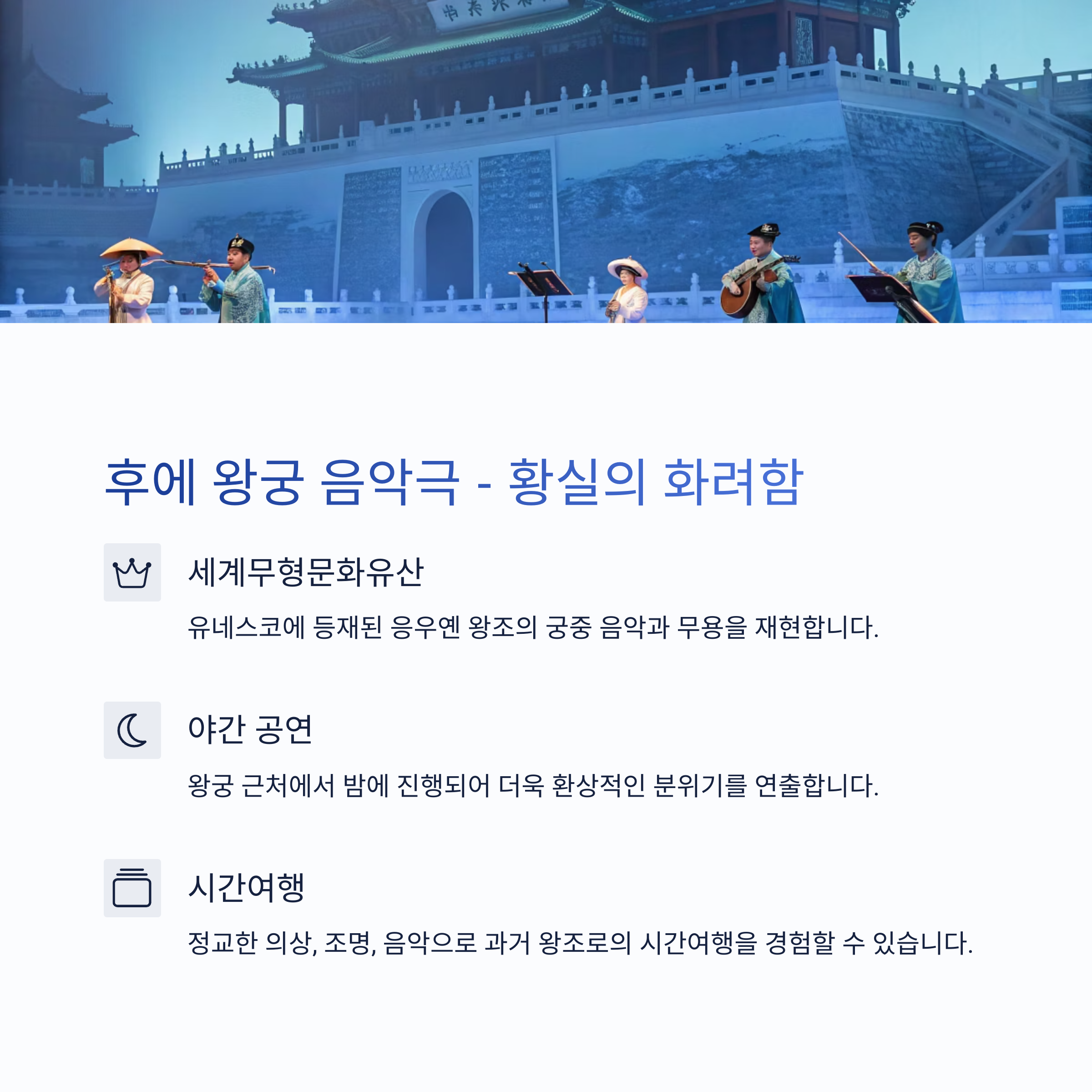 공연 하나로 과거 왕조로의 시간여행을 경험할 수 있습니다.