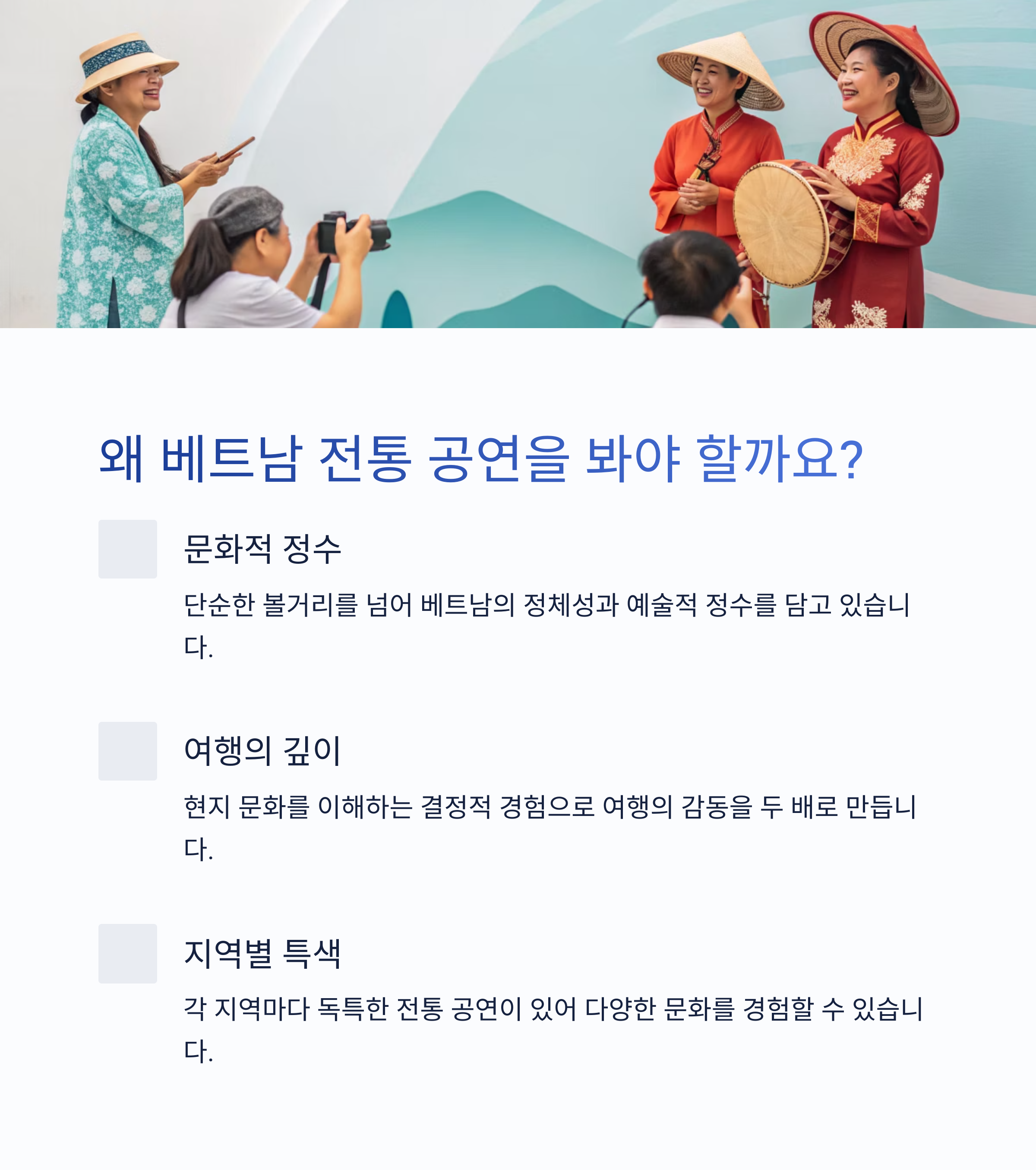 베트남을 여행하면서 놓치기 쉬운 문화 경험 중 하나가 바로 전통 공연 관람입니다.