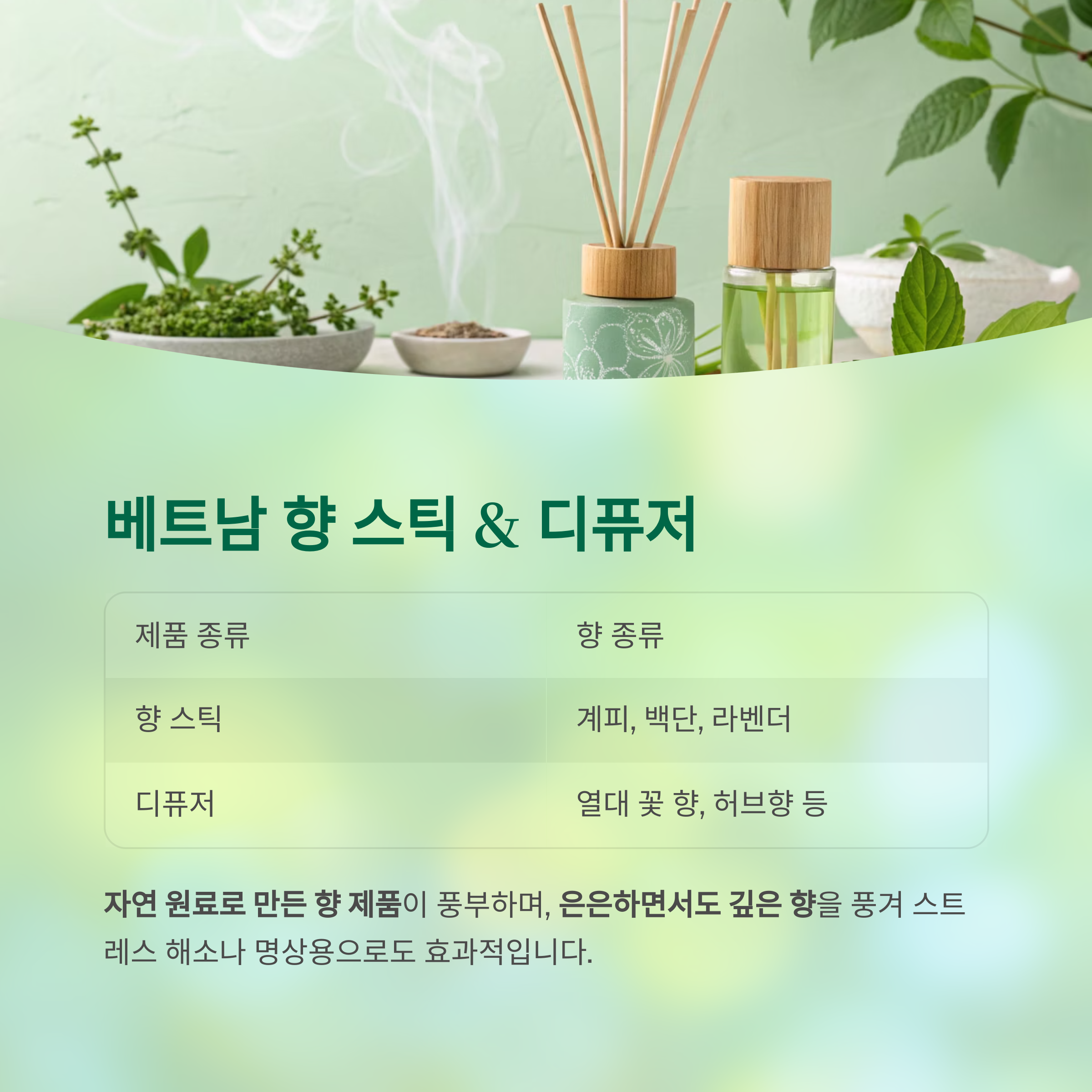 베트남은 향 스틱 문화가 오래된 만큼, 자연 원료로 만든 향 제품이 풍부합니다.