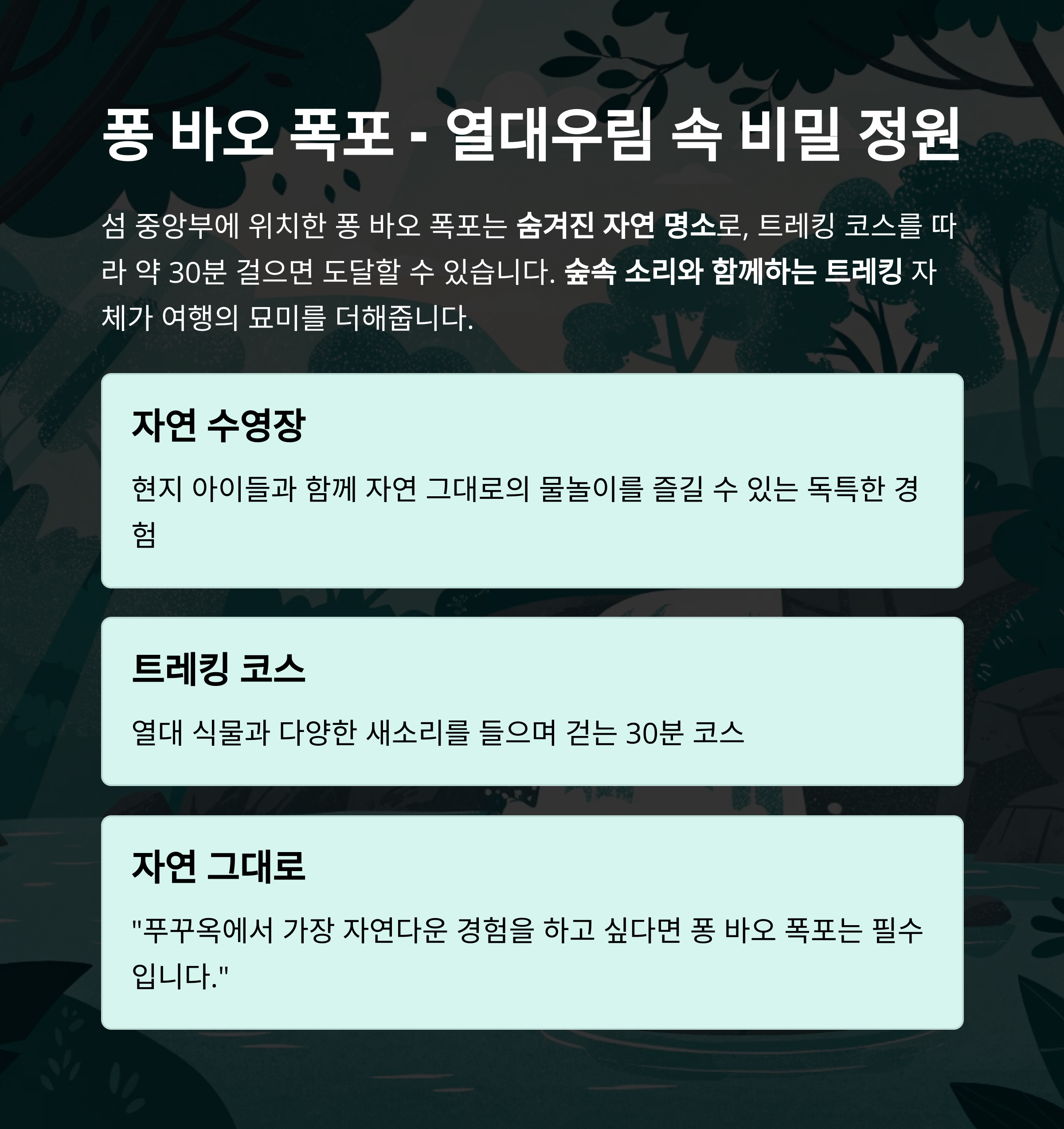 "푸꾸옥에서 가장 자연다운 경험을 하고 싶다면 퐁 바오 폭포는 필수입니다."