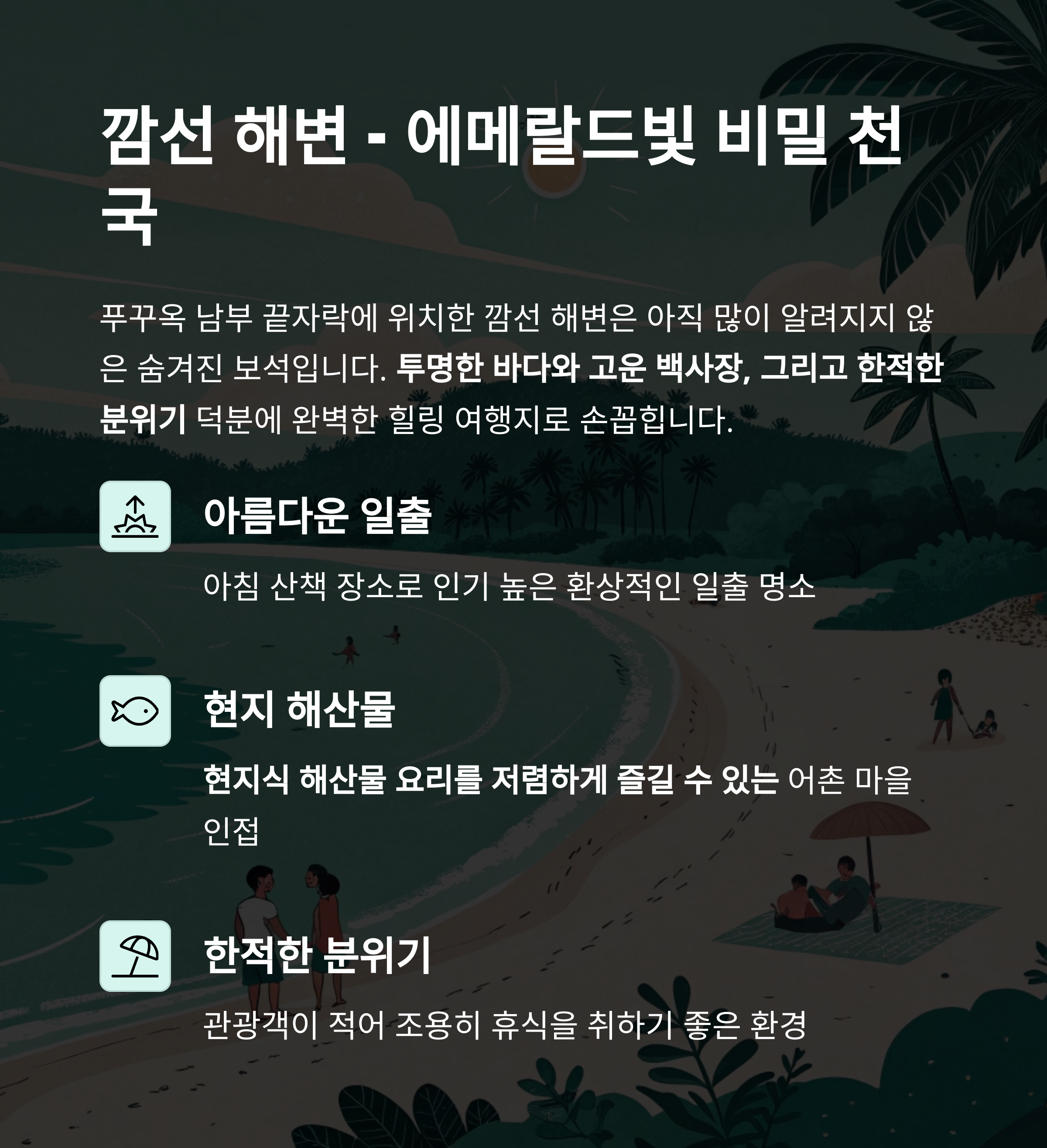 푸꾸옥 남부 끝자락에 위치한 깜선 해변은 아직 잘 알려지지 않은 해변입니다.
