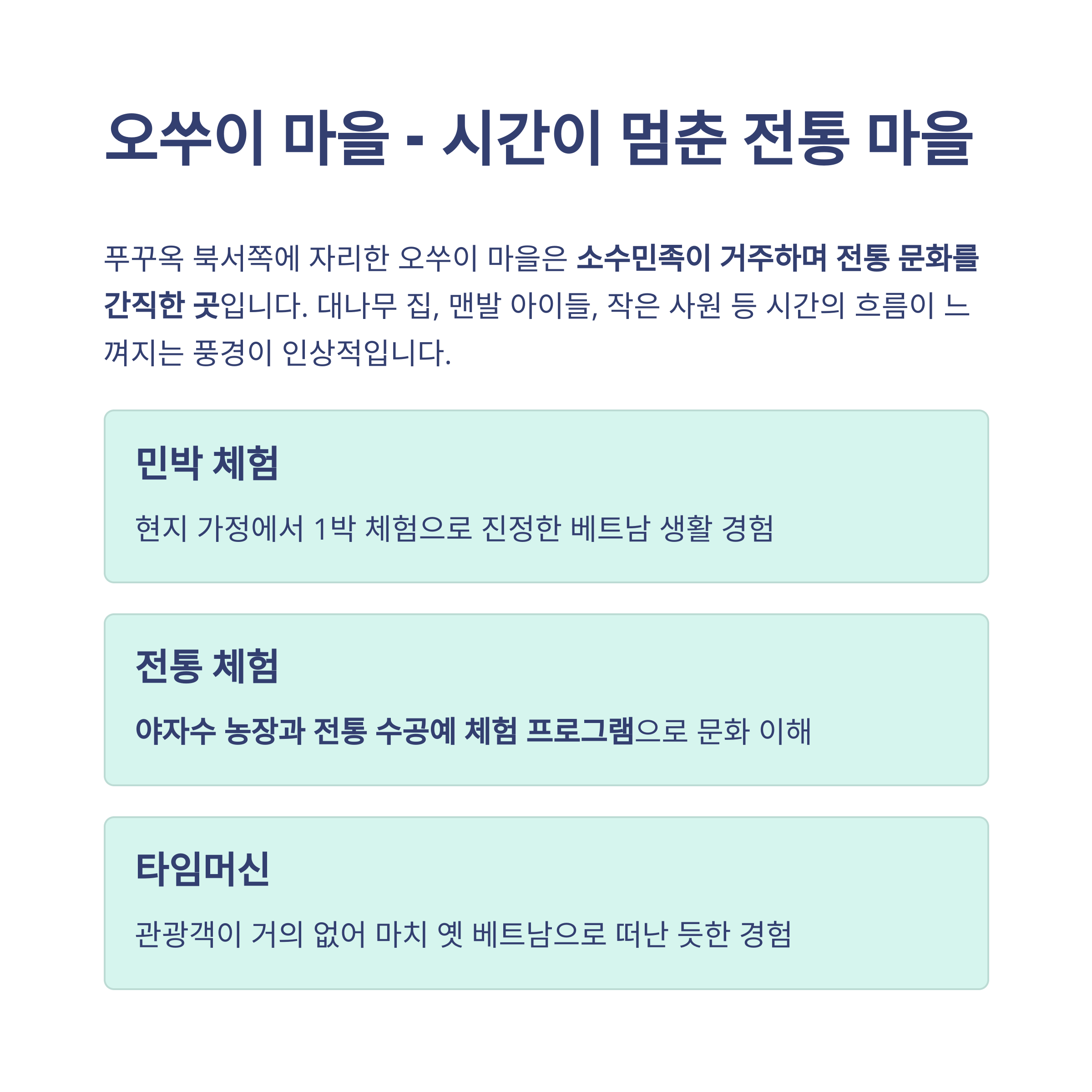 푸꾸옥 북서쪽에 자리한 오쑤이 마을은 소수민족이 거주하며 전통 문화를 간직한 곳입니다.