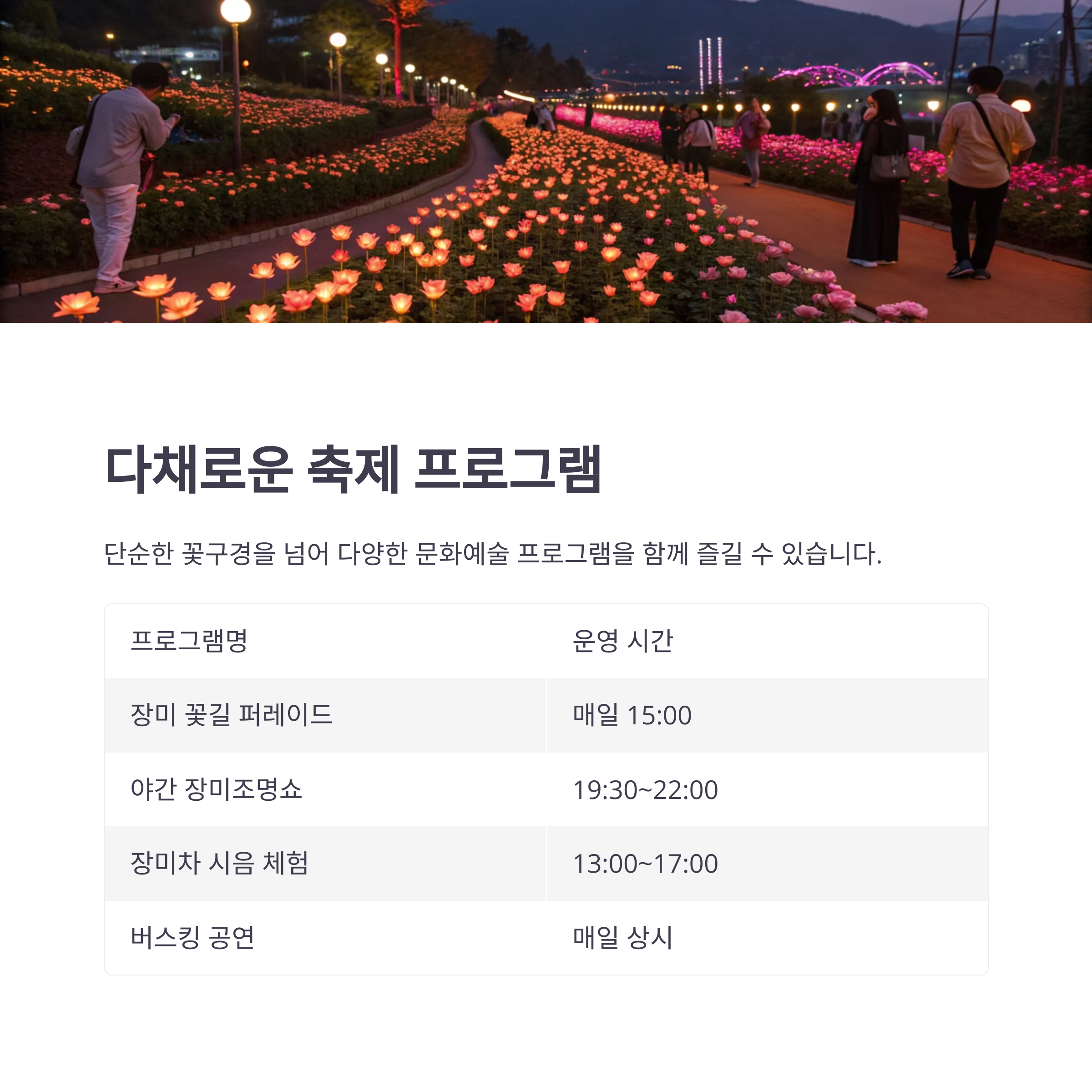 | 야간 장미조명쇼 | 19:30 ~ 22:00 | 장미정원 일대 |