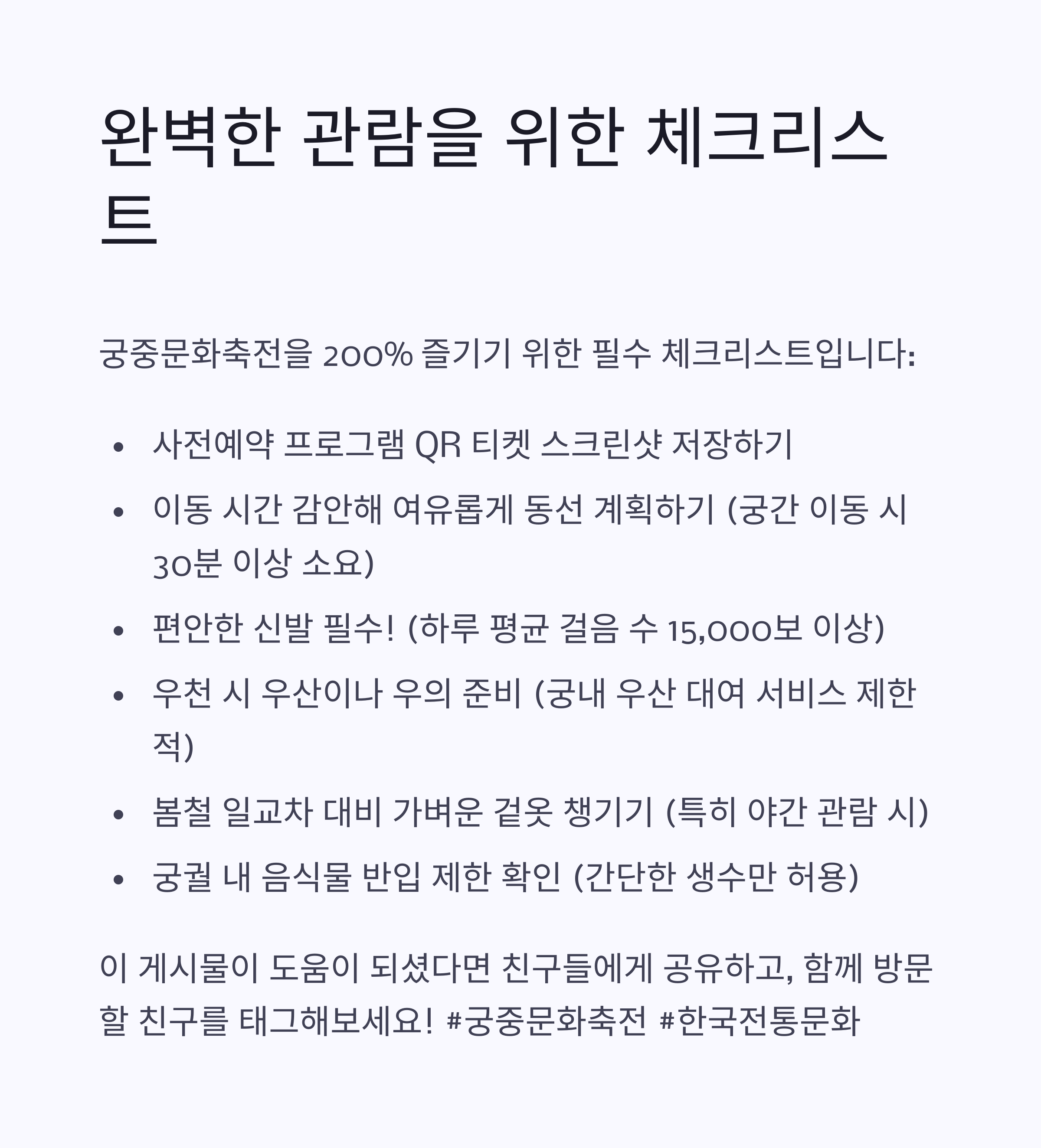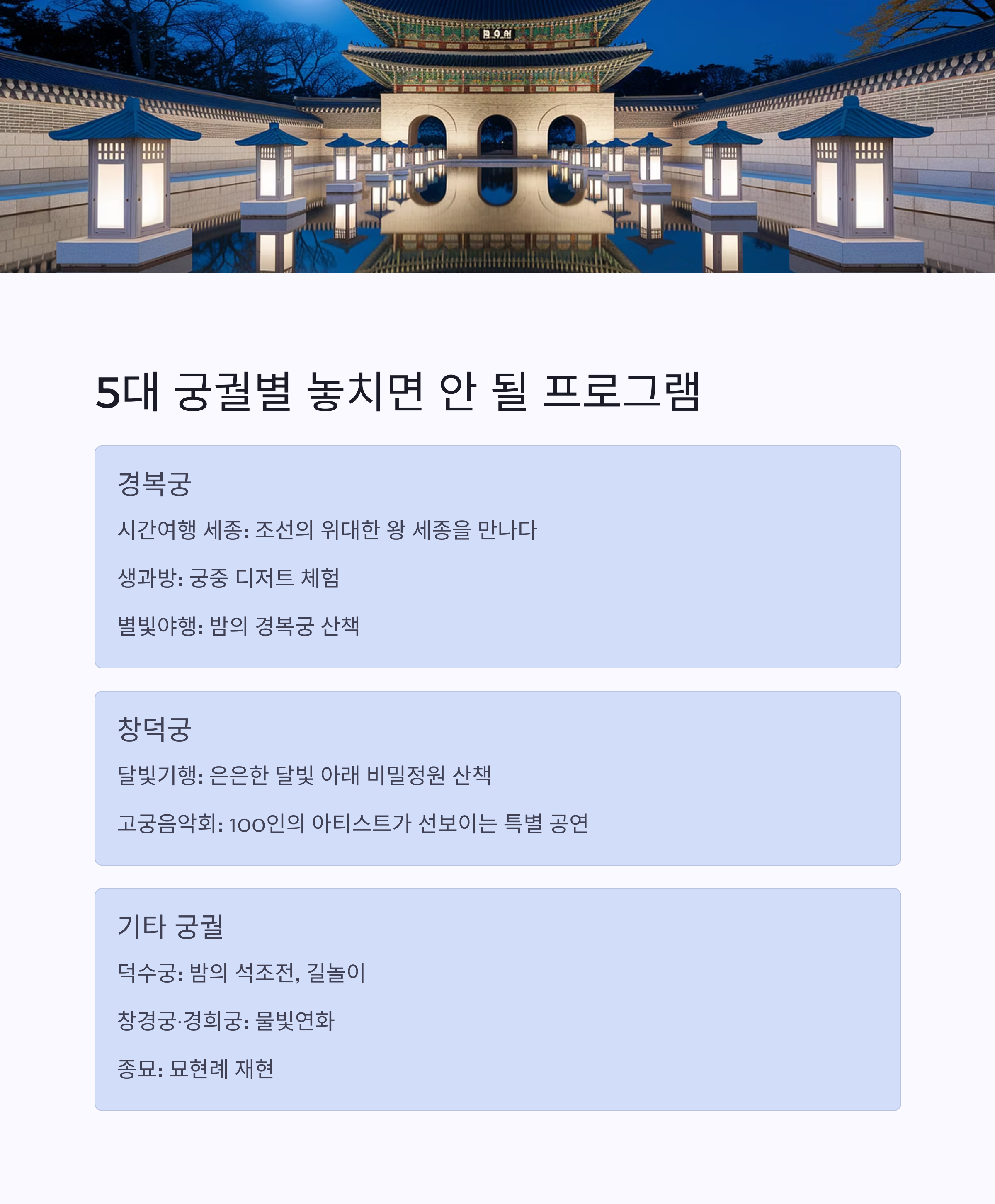 "궁별로 테마가 다르기 때문에, 미리 일정을 체크하고 이동 동선을 짜면 더 알차게 즐길 수 있어요!" 😊