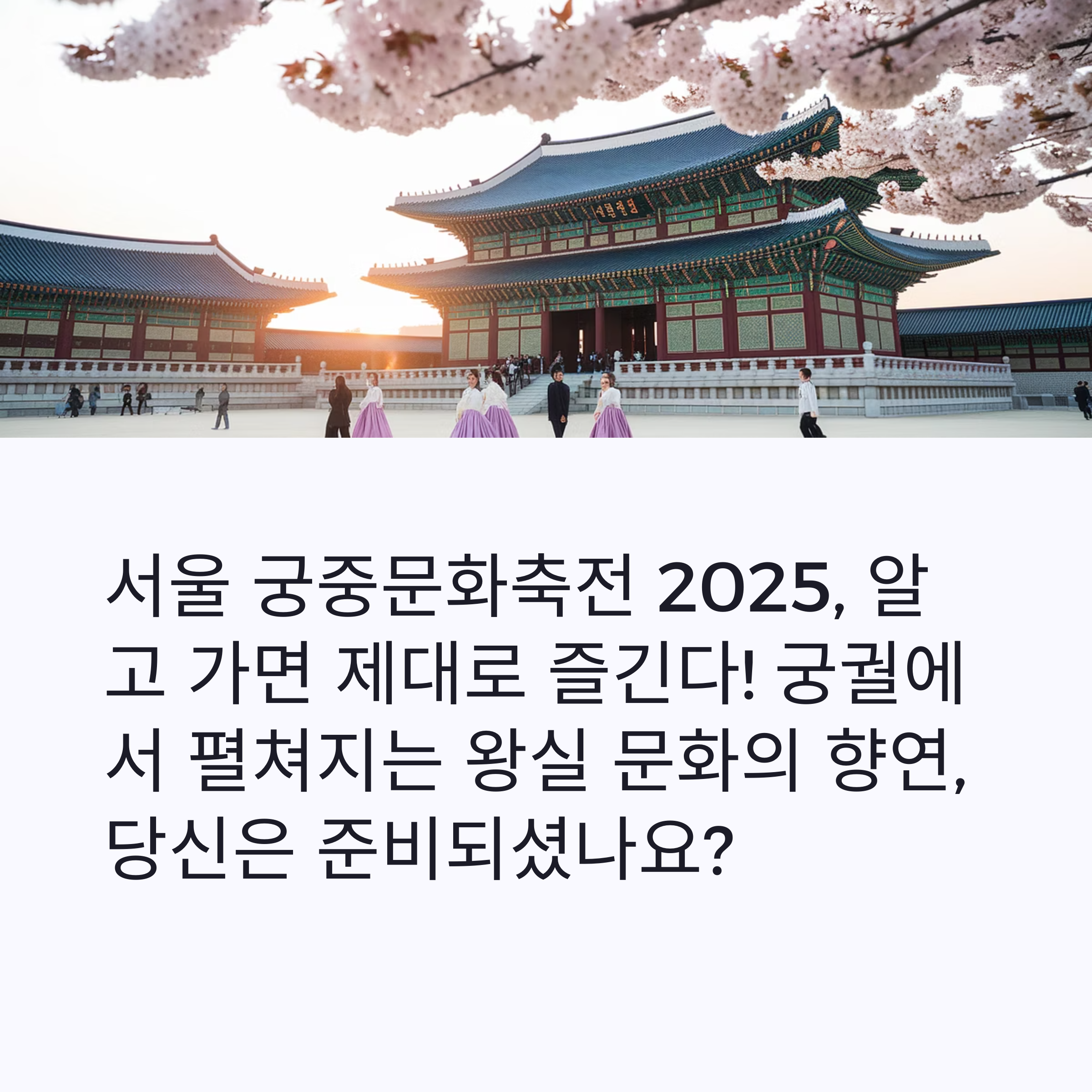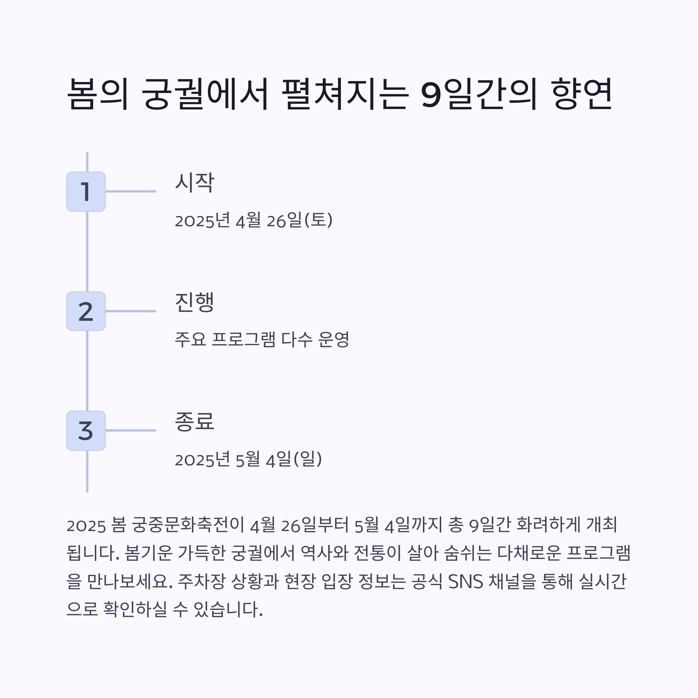 2025년 서울 궁중문화축전은 4월 26일(토)부터 5월 4일(일)까지 9일간 진행됩니다.