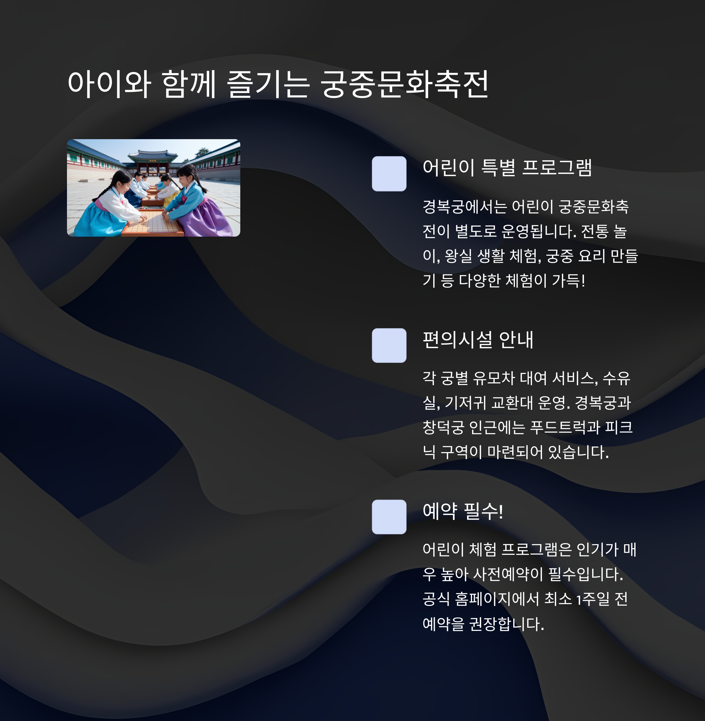 어린이를 위한 전통놀이 체험, 궁중 음식 만들기, 왕실 보물 찾기 프로그램도 준비되어 있습니다.