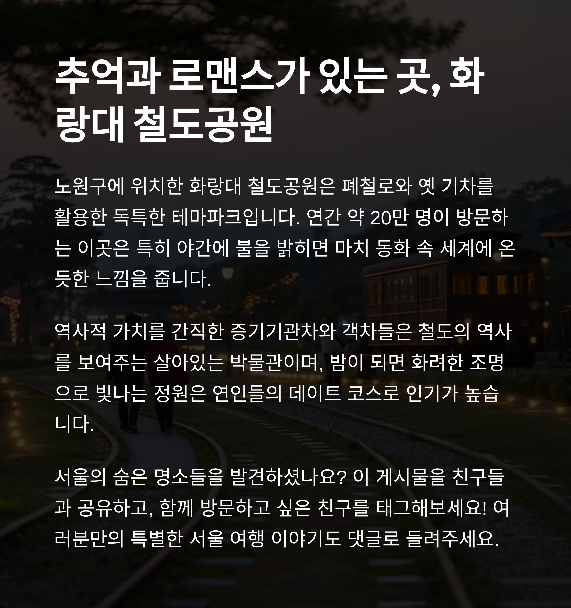 여러분이 가장 좋아하는 서울의 숨은 명소는 무엇인가요? 댓글로 공유해 주세요! 여러분의 경험을 듣고 싶습니다.