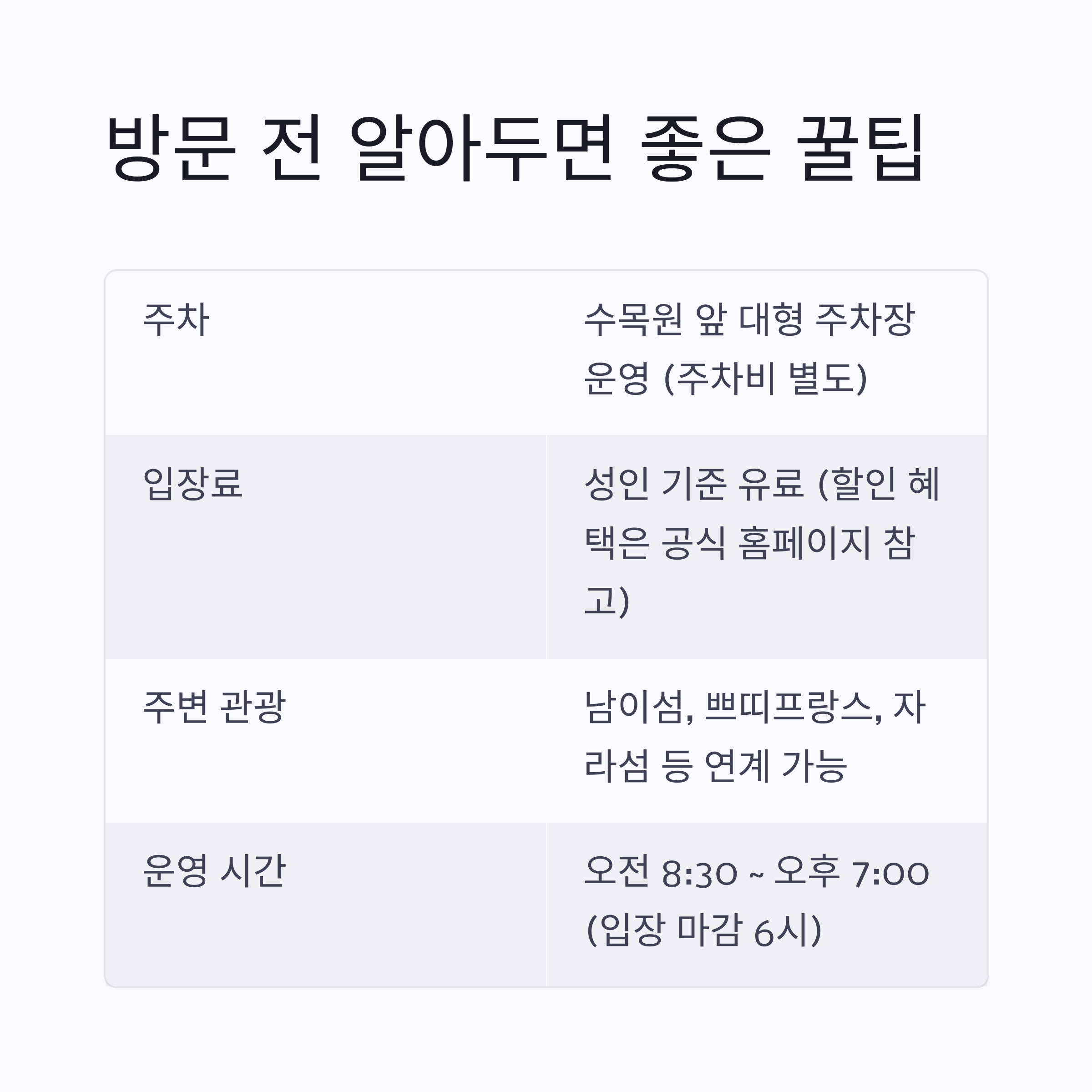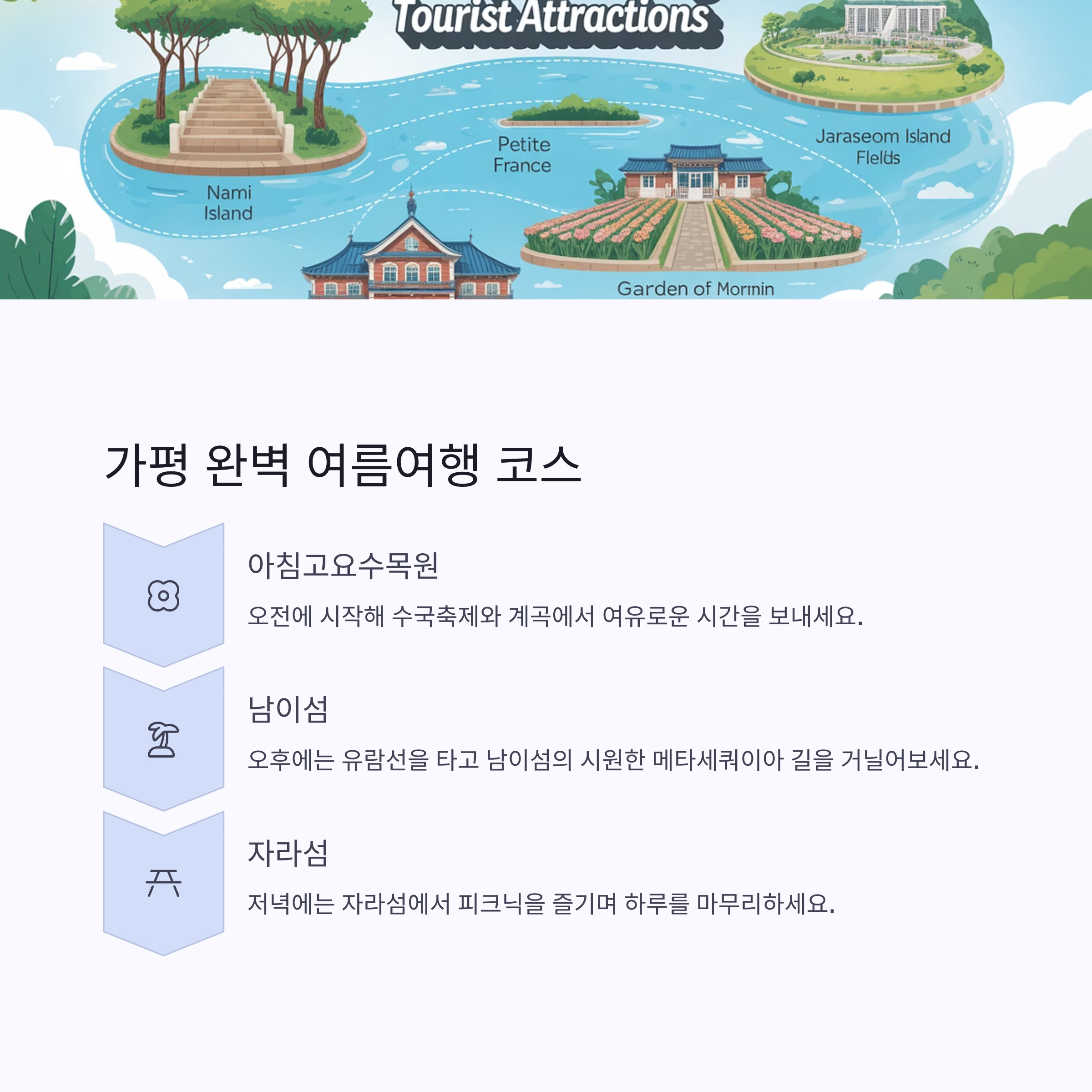 | 주변 관광 | 남이섬, 쁘띠프랑스, 자라섬 등 연계 가능 |