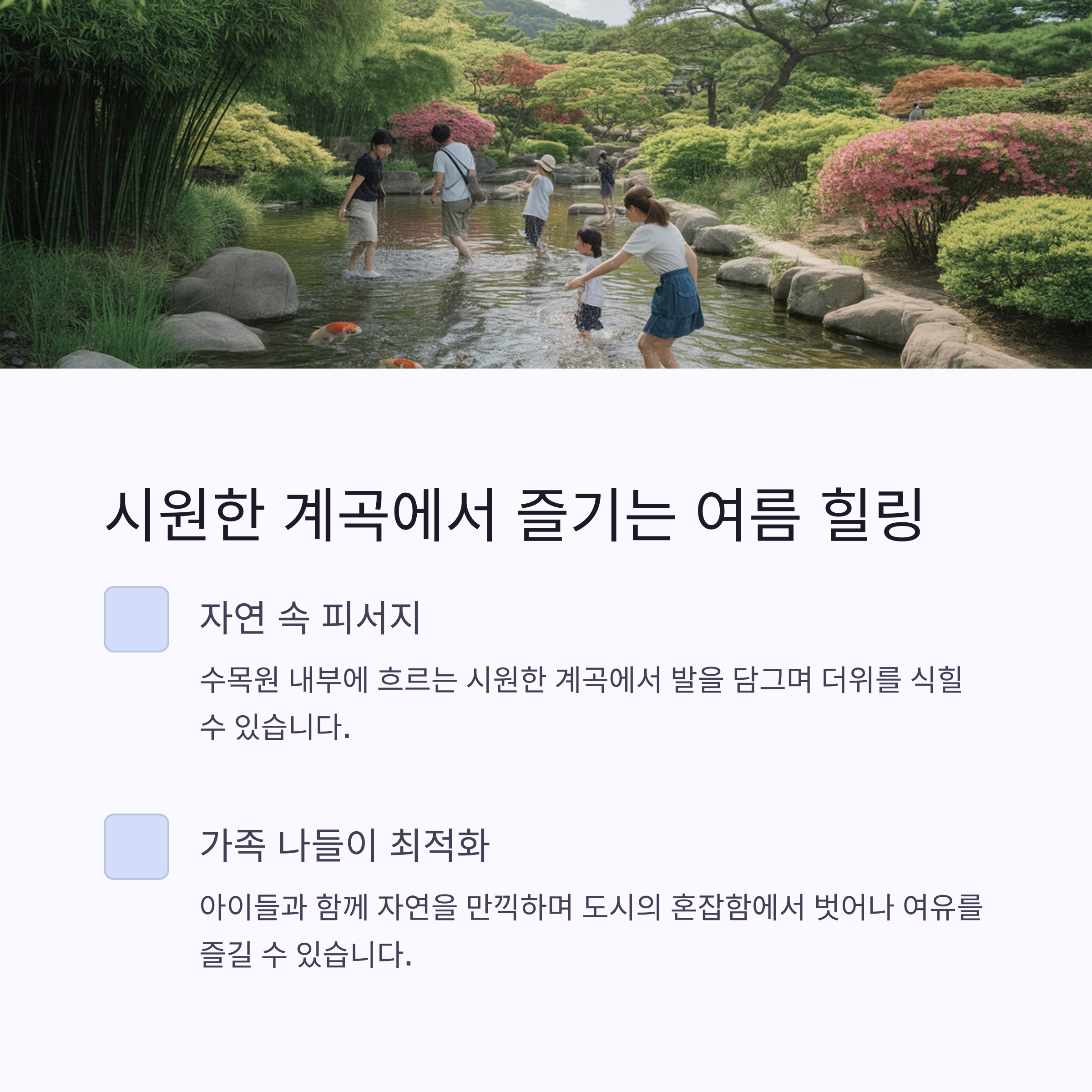 주요 테마 산수국, 여름꽃, 계곡, 포토존