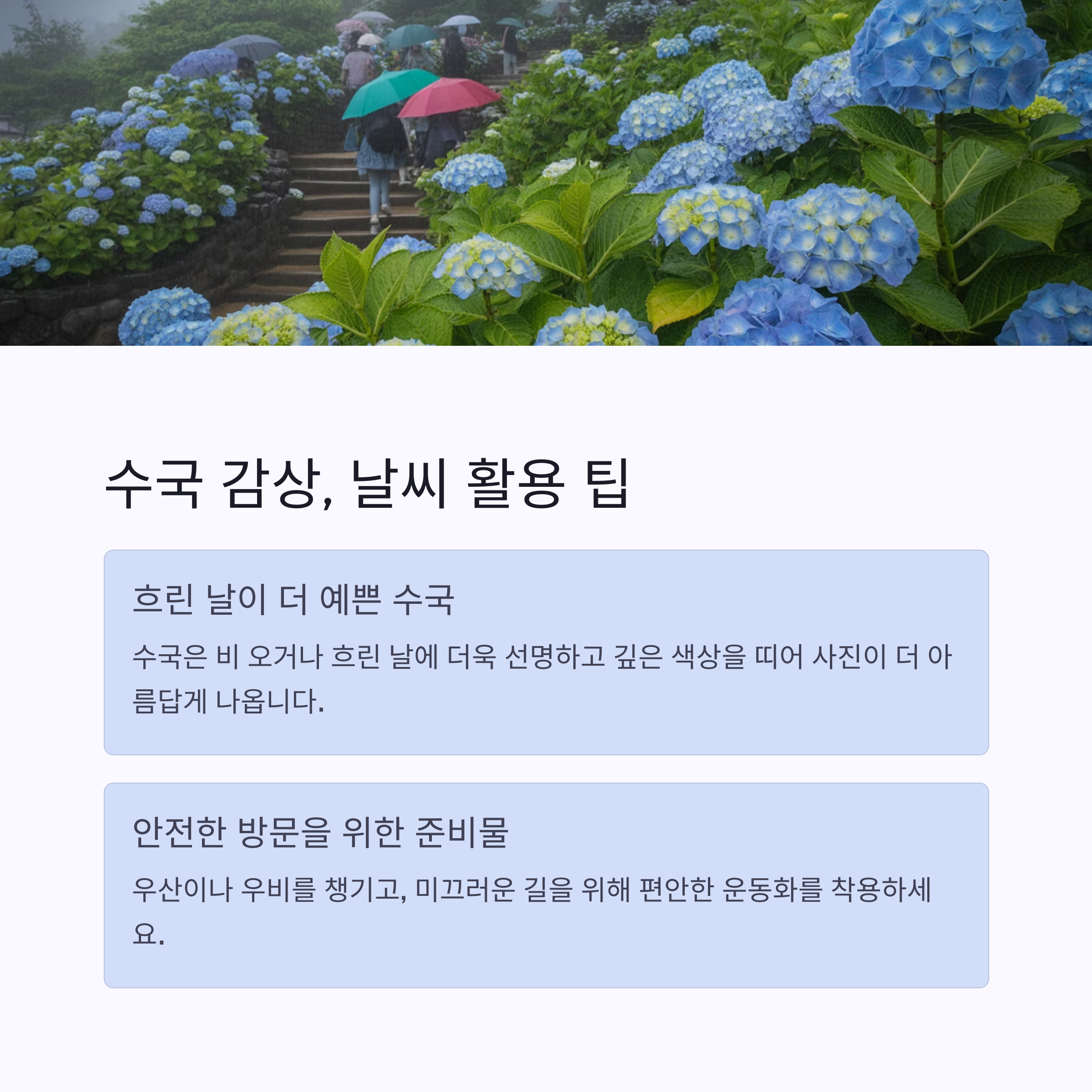 | 주요 테마 | 산수국, 여름꽃, 계곡, 포토존 |