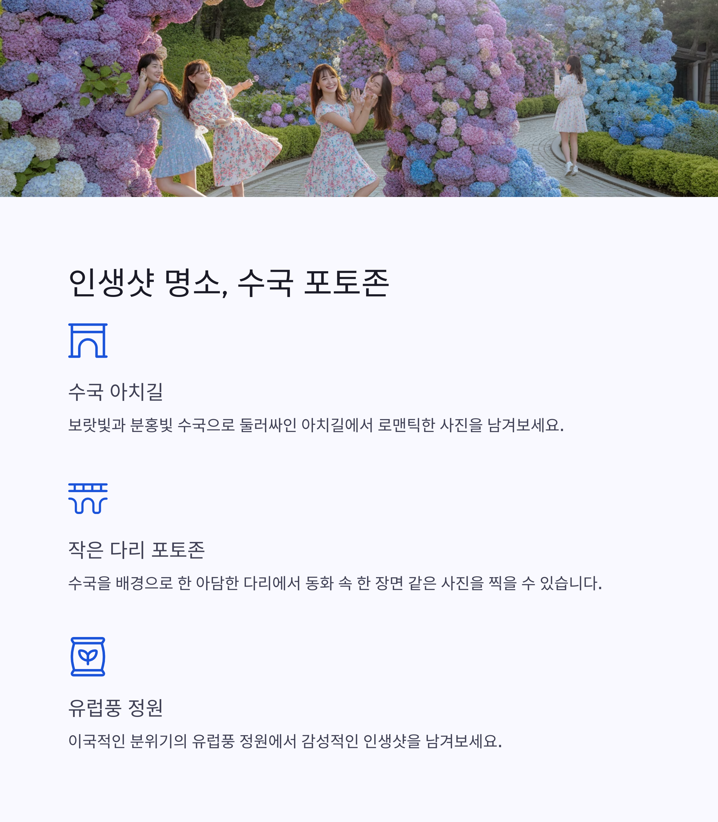 수국 아치길, 작은 다리 위, 유럽풍 정원 등 다양한 테마 포토존이