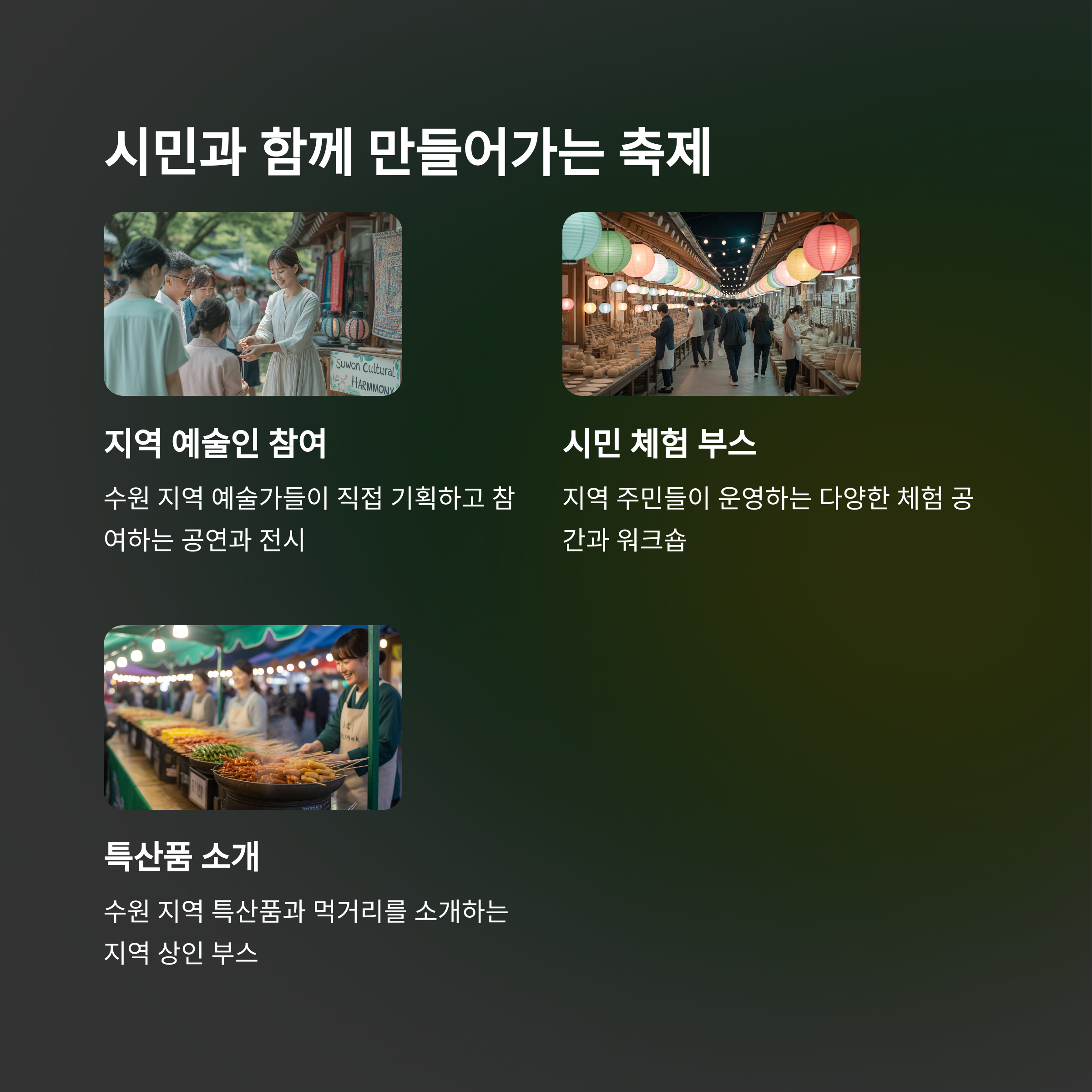 지역 주민과 예술인, 청년 기획자들이 함께 만들어가는 참여형 축제입니다.