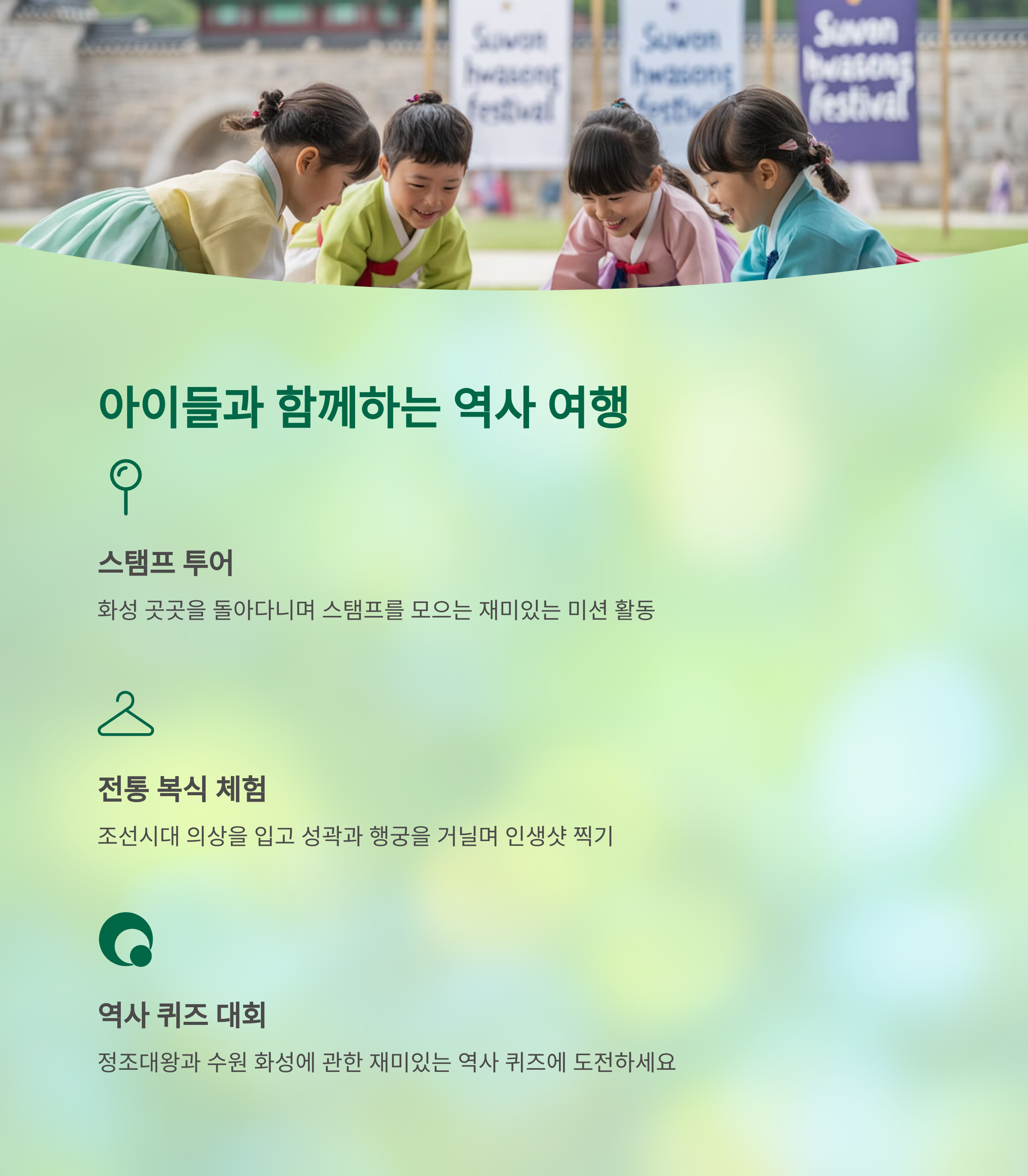 수원 화성의 유서 깊은 이야기를 가까이서 느낄 수 있는 기회가 될 것입니다.