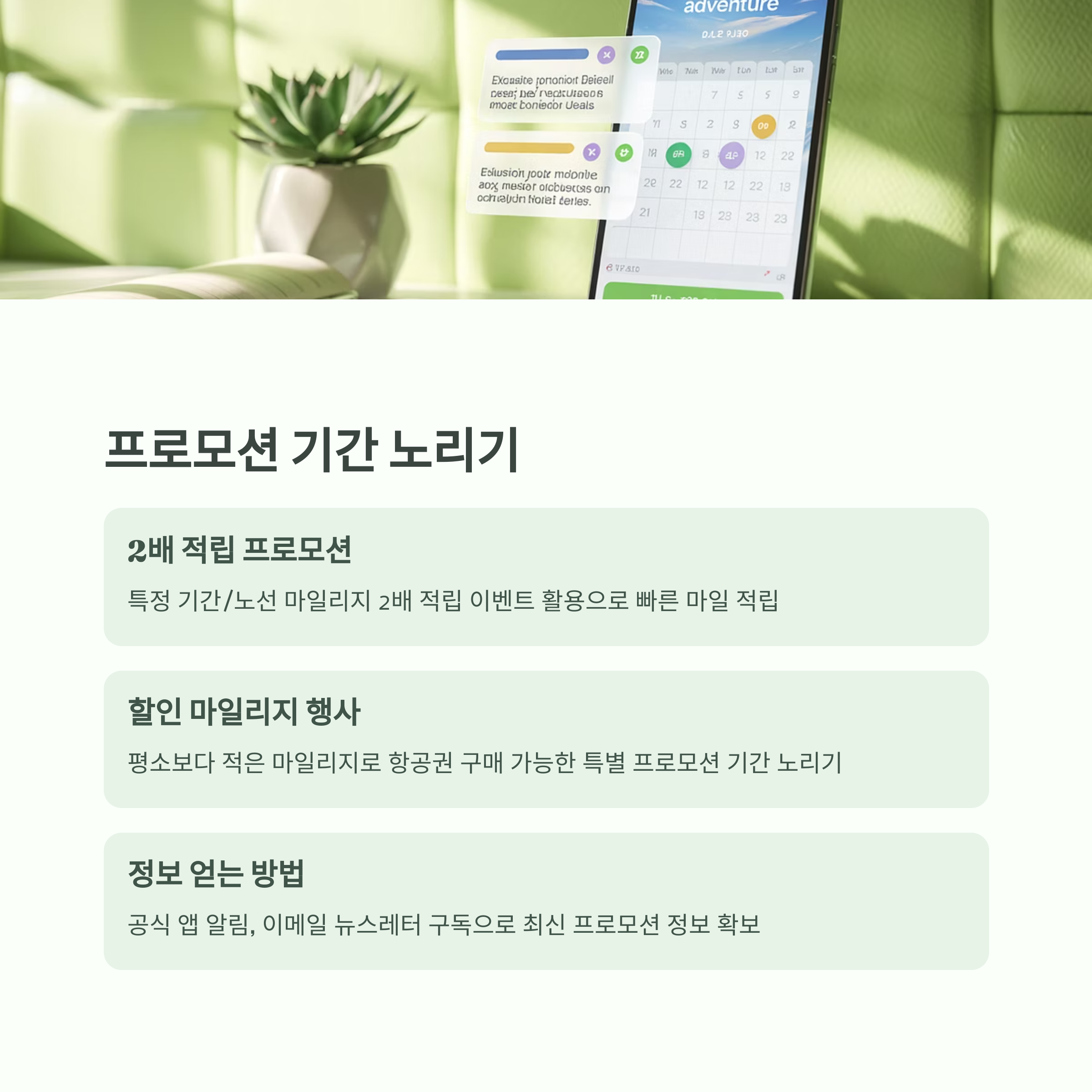 "보너스 항공권 할인, 업그레이드 마일리지 절감 이벤트 등을 활용하세요."