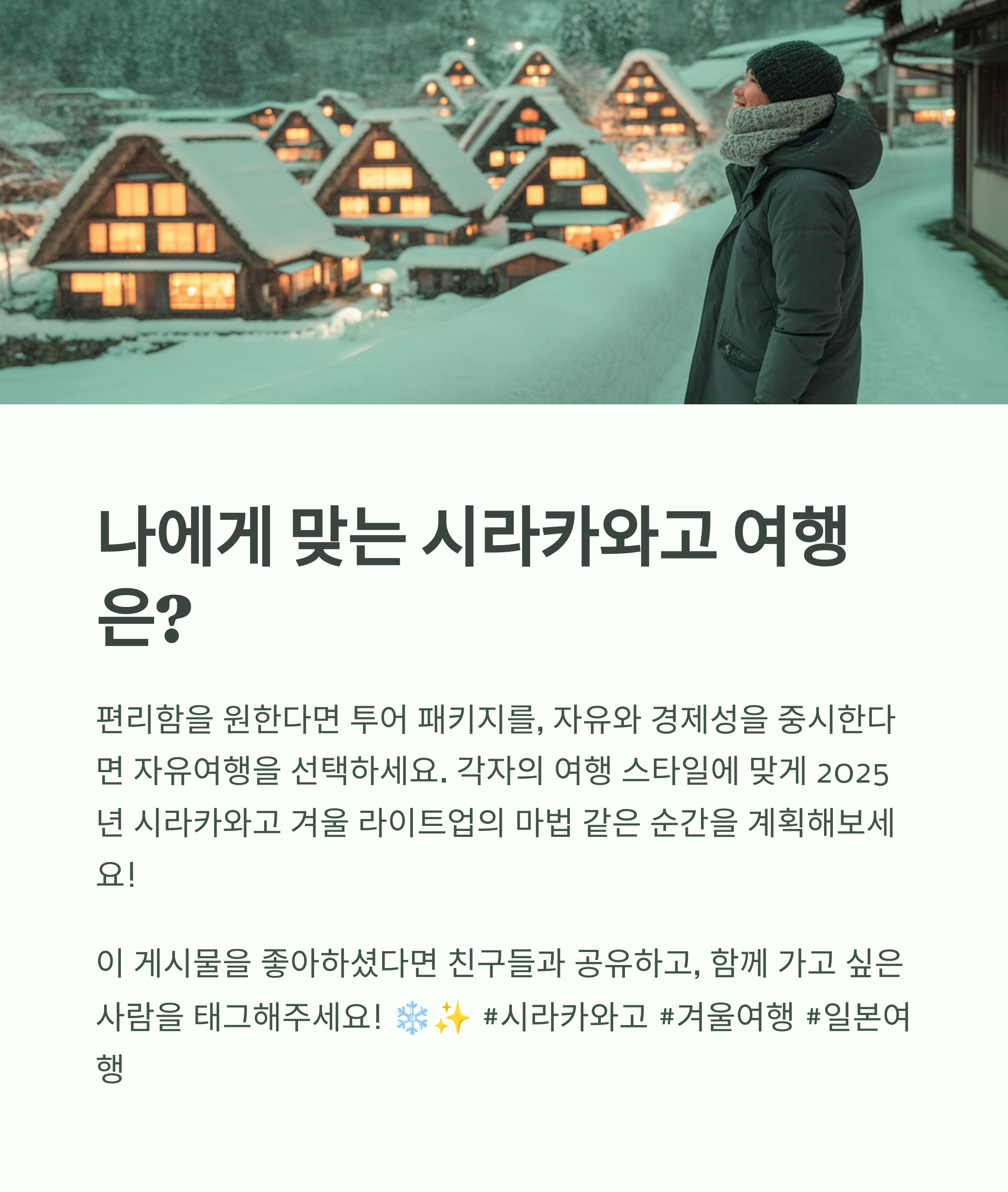 | Q. 시라카와고 라이트업 투어와 개별 여행의 가장 큰 차이는 무엇인가요? |